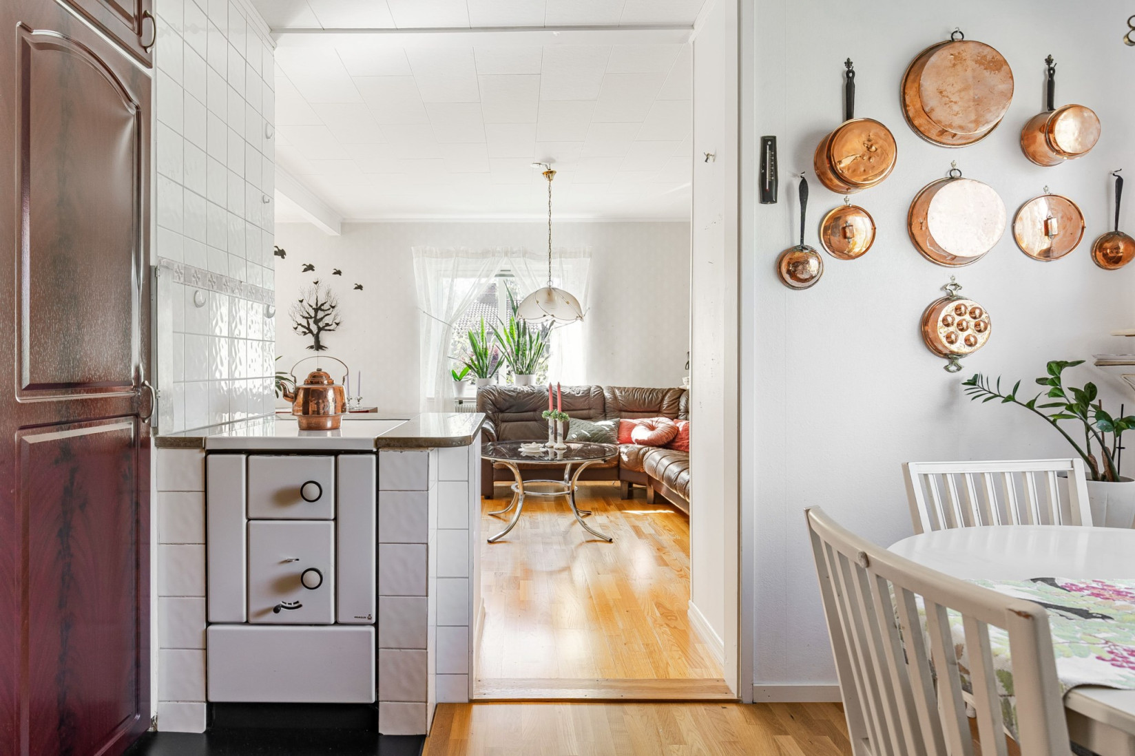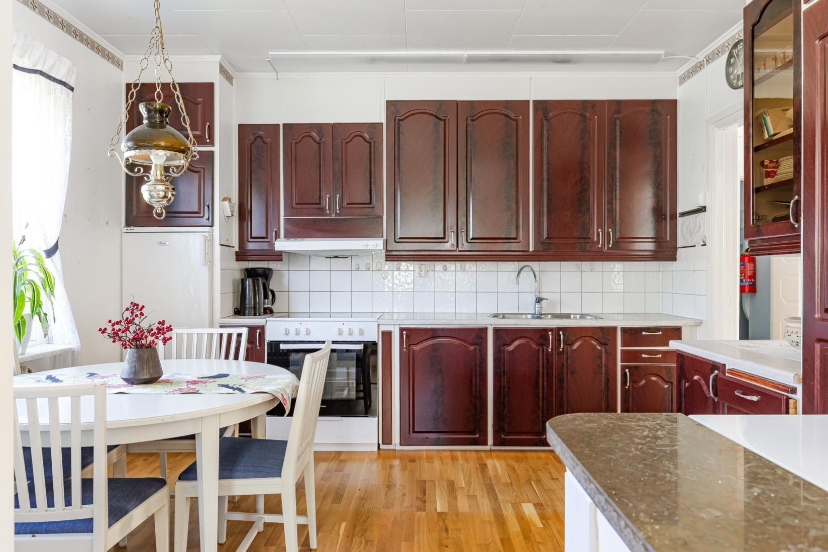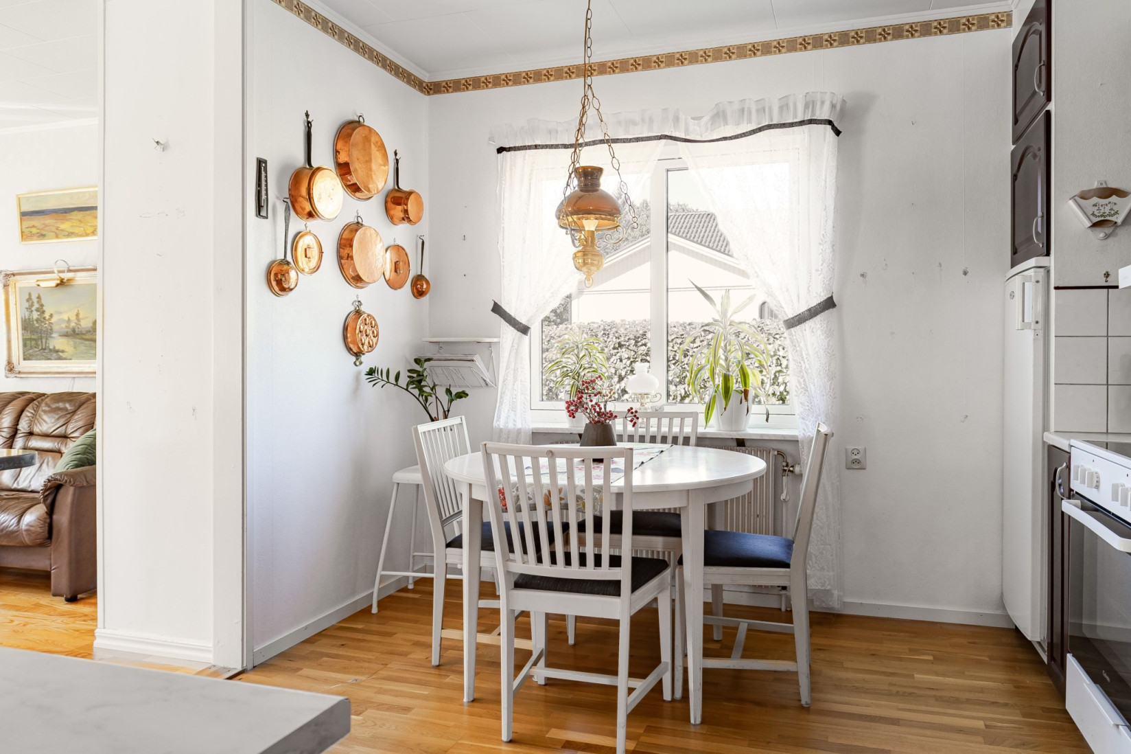 Väl inne möts du av ett rymligt kök med bra arbetsytor och naturligt ljusinsläpp från fönstret. Här finns plats för ett matbord för 4–6 personer, perfekt för vardagens måltider. Köket är utrustat med kyl, fläkt, vedpanna och ugn, och har en lagom öppen planlösning som skapar kontakt med sällskapsrummet.