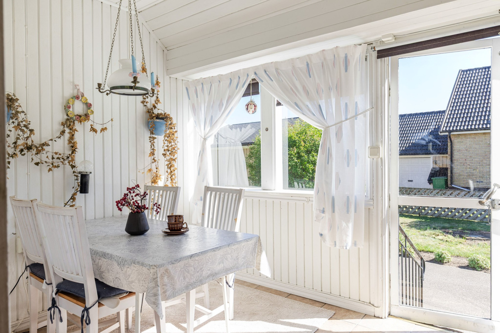 Innan du kliver in i huset passerar du en trivsam, inbyggd veranda, en uppskattad plats av nuvarande ägare som gärna använts för både kaffe och avkoppling.