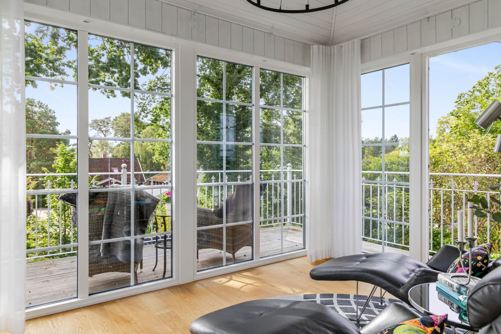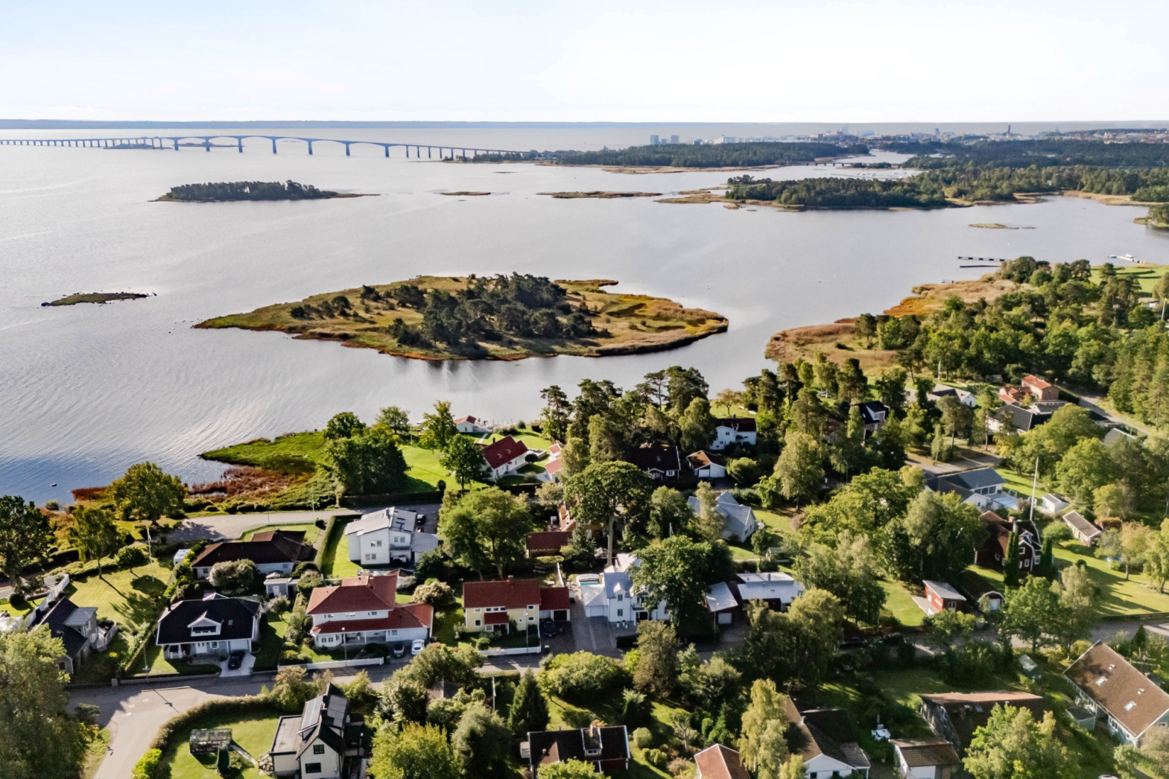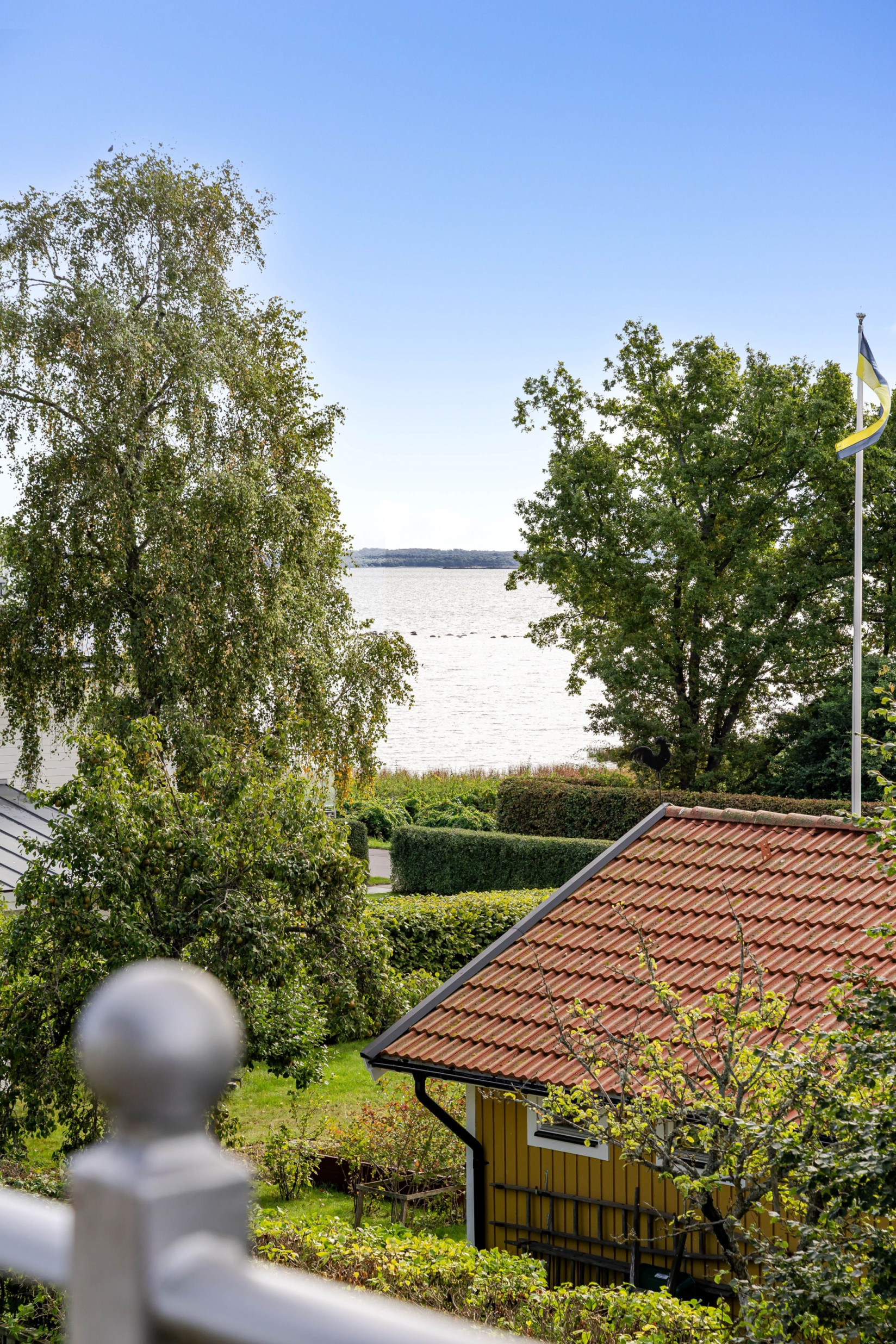 En mindre trappa leder till husets tornrum. Här omges man av fönster från golv till tak som öppnar blicken mot trädgården och havet. Från balkongen sträcker sig utsikten över Kalmarsund och vidare mot Ölandsbron. Morgonsolen sprider sitt sken över landskapet och platsen blir ett rum för stilla stunder med kaffekoppen i handen. Det kan också med lätthet bli platsen där man slår sig till ro med en bok eller för nära samtal tillsammans.
