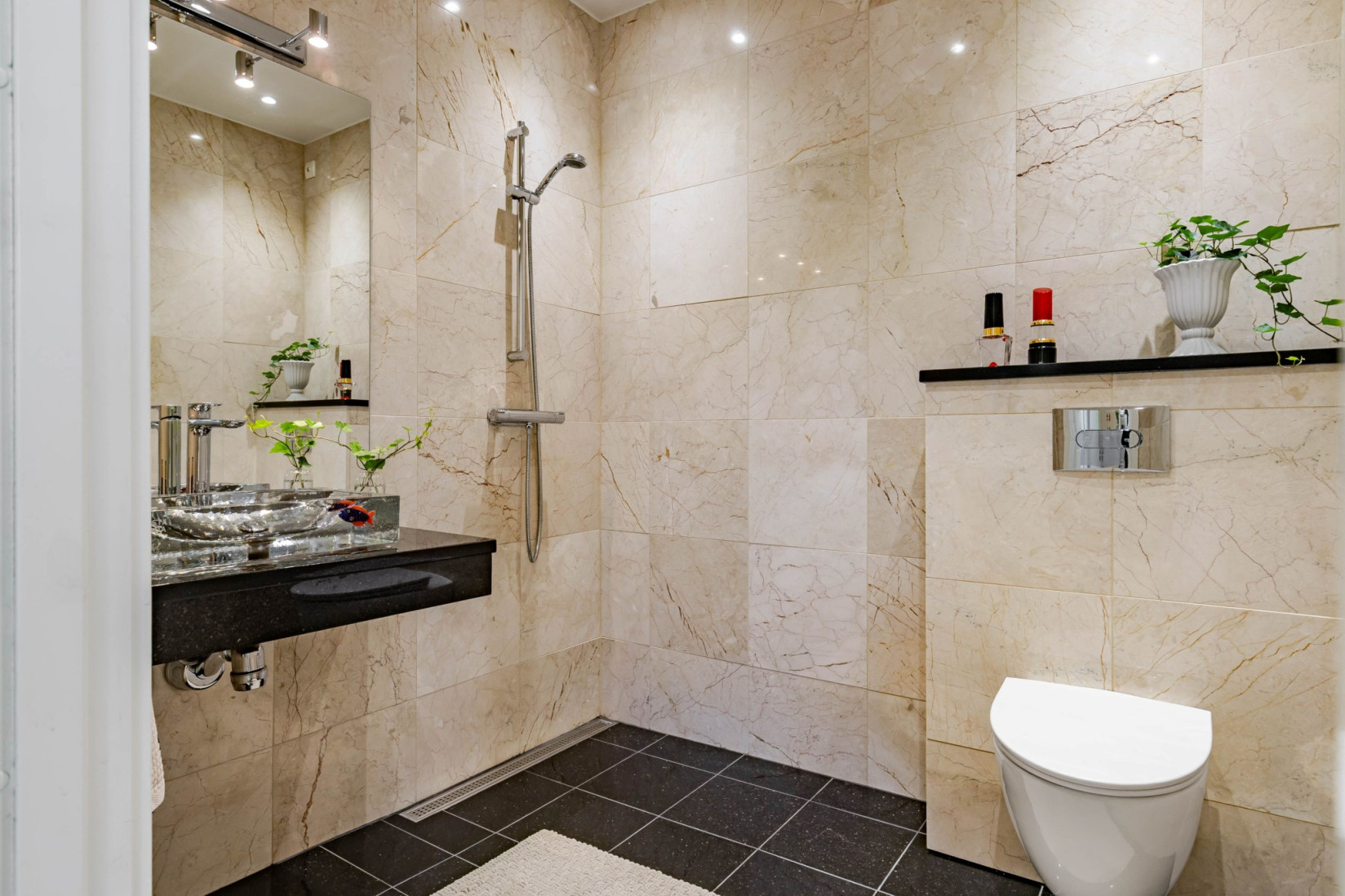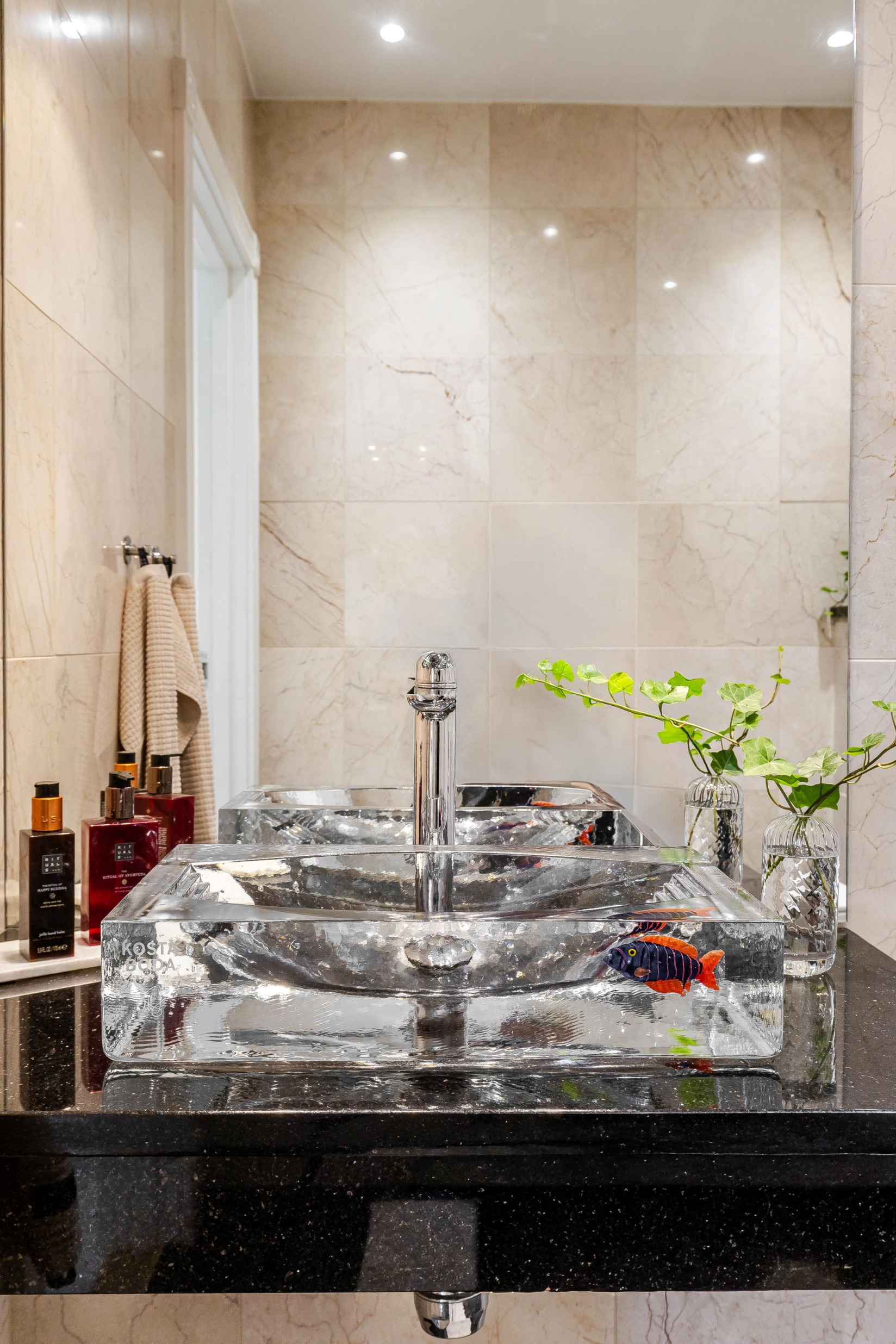 Bottenvåningen rymmer även ett sovrum som lika gärna kan fungera som gästrum eller arbetsrum. Intill ligger ett badrum som är klätt i samma marmor som golvet och kompletteras med en svart bänkskiva i granit. På bänken står ett handfat i glas, skapat av konstnären Kjell Engman. En fisk är ingjuten i glasmassan, som om den simmade i en stilla rörelse – en detalj som gör rummet till ett konstverk. I badrummet finner vi också en dusch samt en vägghängd wc.