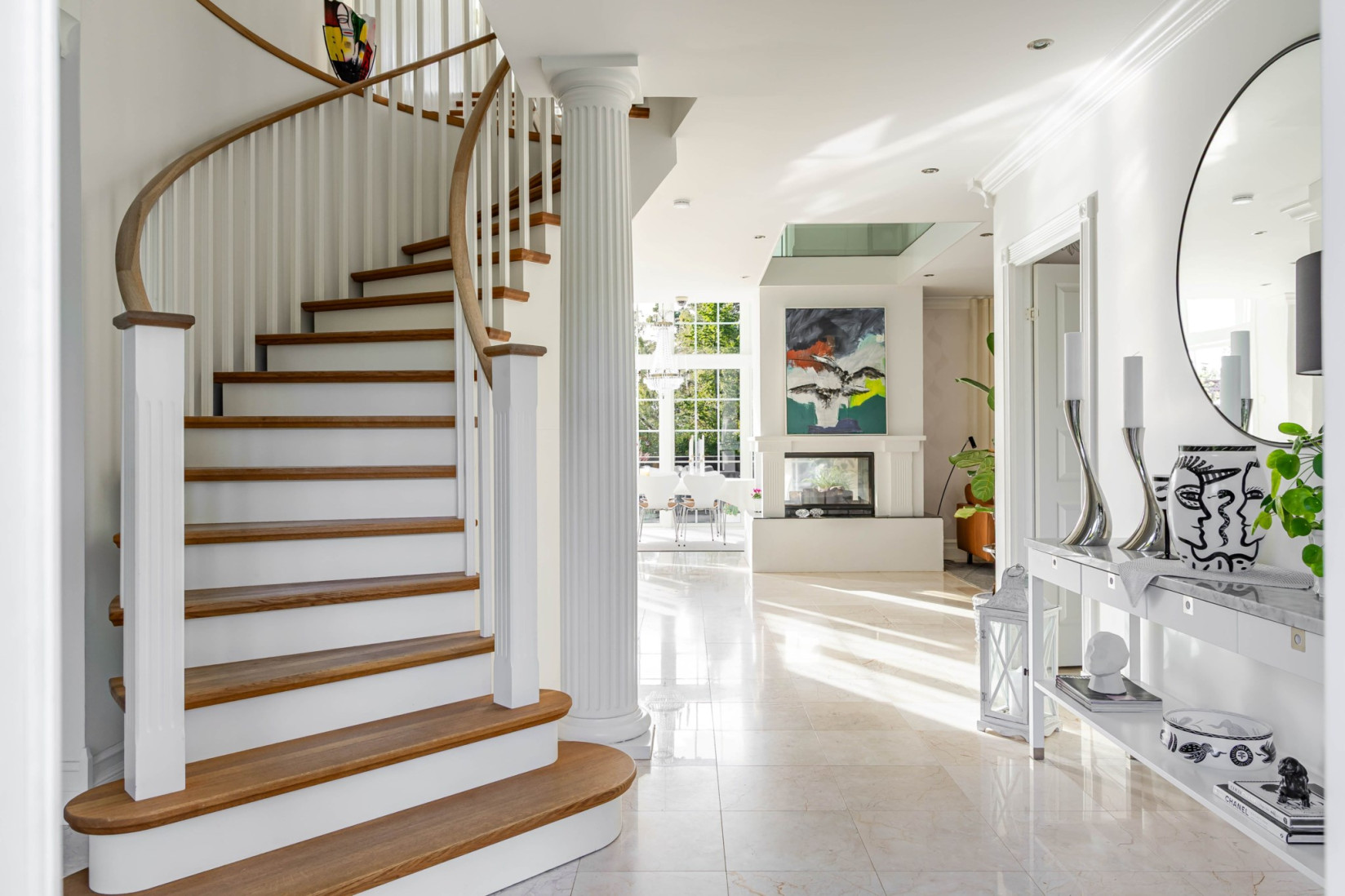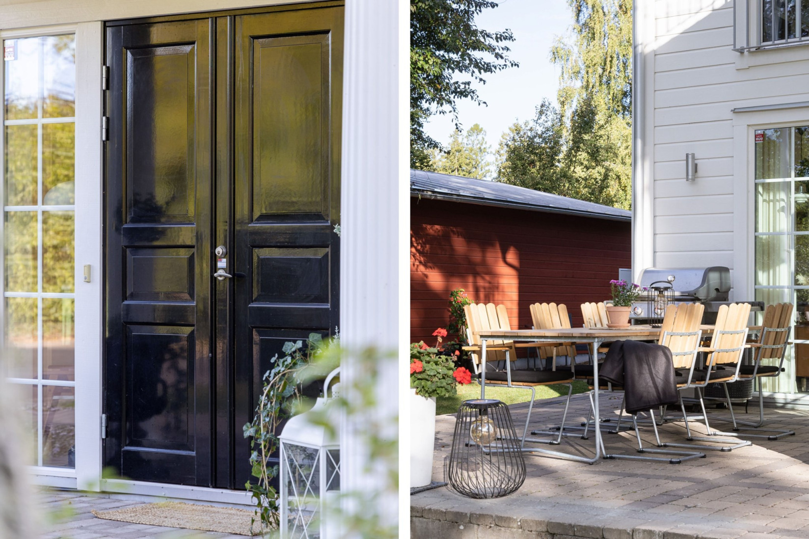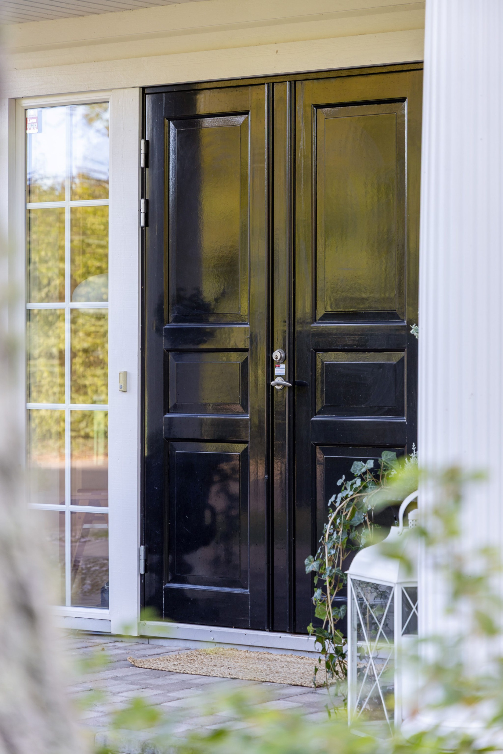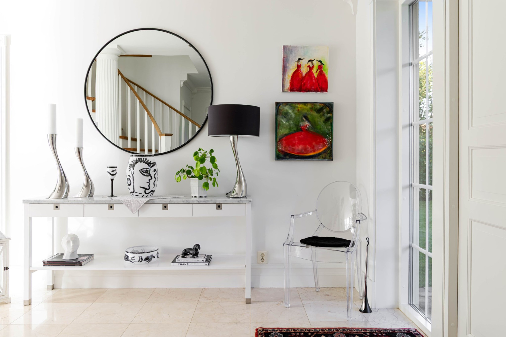 De frästa pelarna bjuder in oss till den svarta dubbeldörren i entrén som öppnas med tyngd och elegans och avslöjar en hall där ljuset omedelbart fångar blicken. Spröjsade fönster sträcker sig från golv till tak och släpper in dagen.