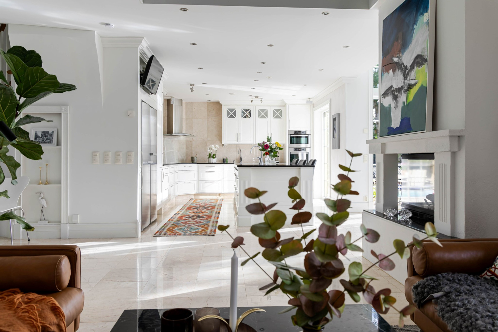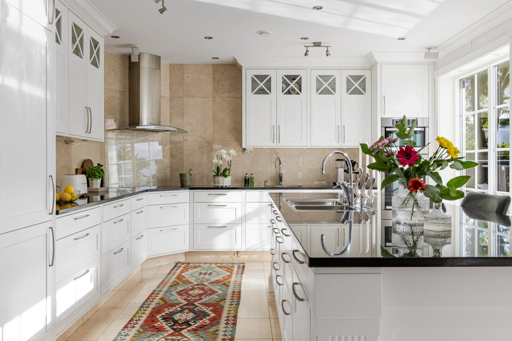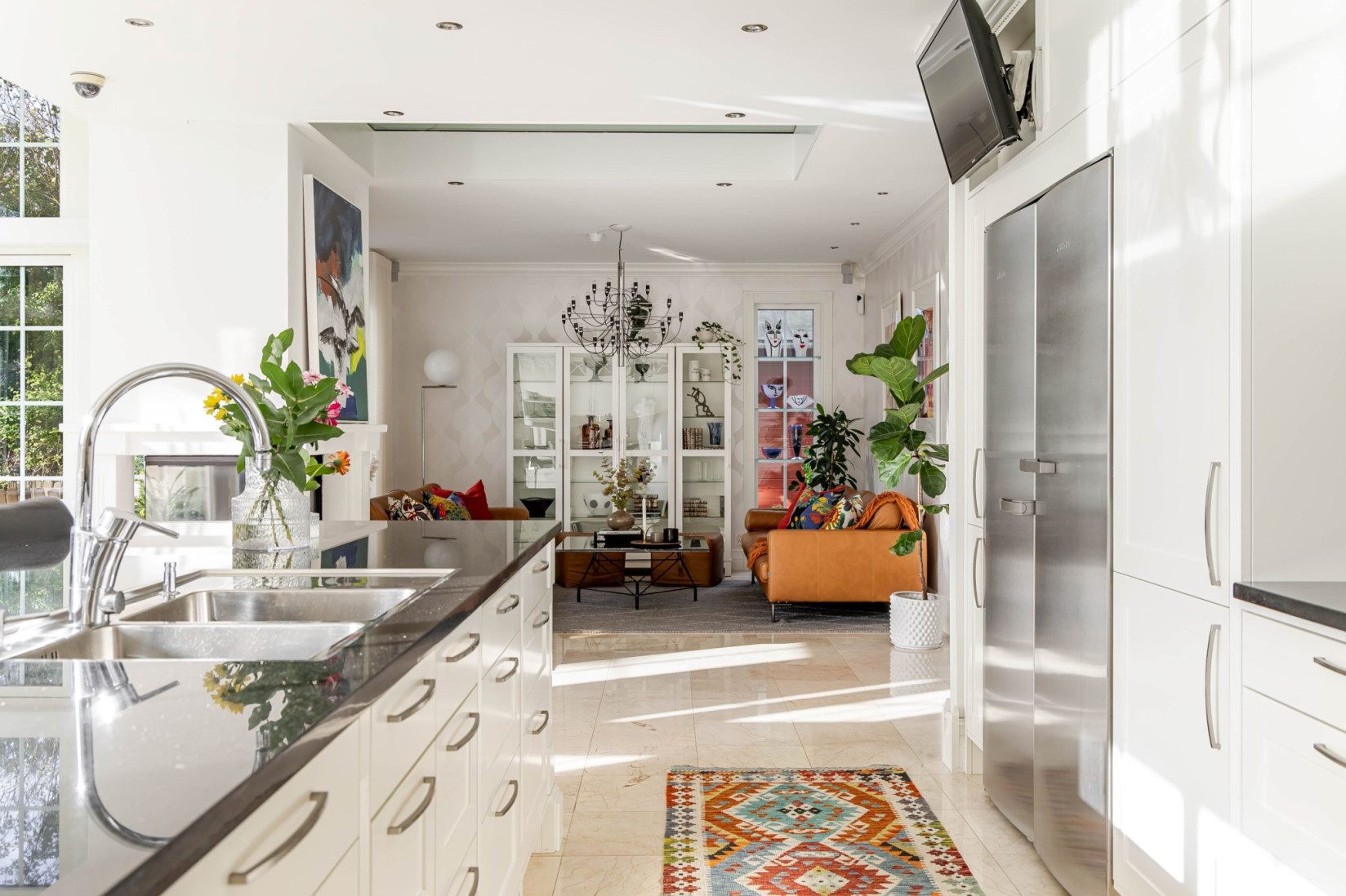 Från hallen leds man in i hjärtat av huset. Här möts kök, matsal och vardagsrum i en öppen planlösning som andas både gemenskap och elegans. Köket från Vicklebykök är gnistrande vitt med arbetsytor i mörk indisk granit som både för tankarna till exklusivitet och tidlöshet. Den rymliga köksön bjuder in till samtal och sällskap under matlagningen, och med dubbla ugnar, dubbla kylar och frysar samt dubbla vaskar finns all funktion man kan önska även för den kräsna kocken. De rostfria vitvarorna från Miele speglar ljuset och kompletterar den sobra helheten.