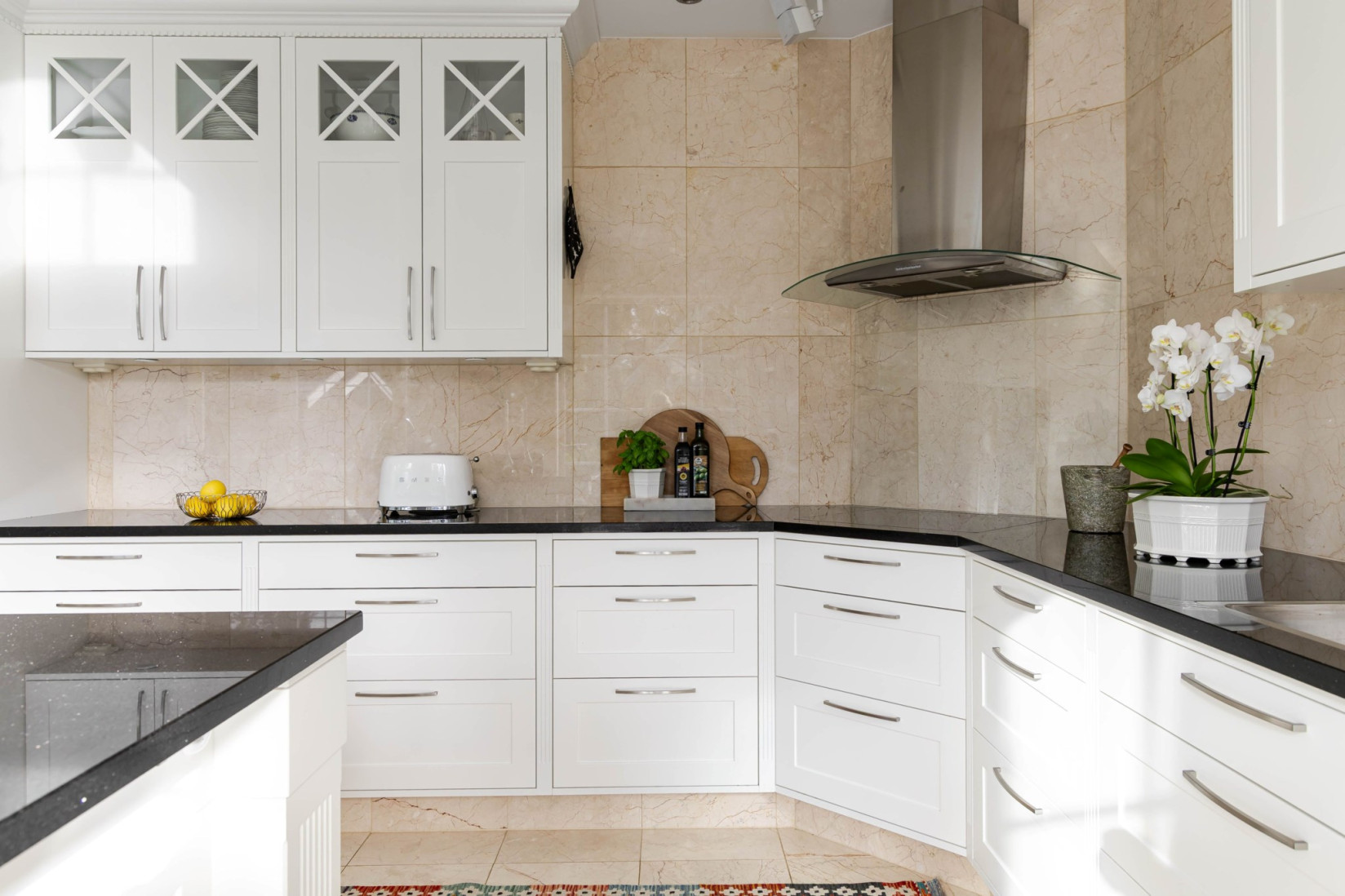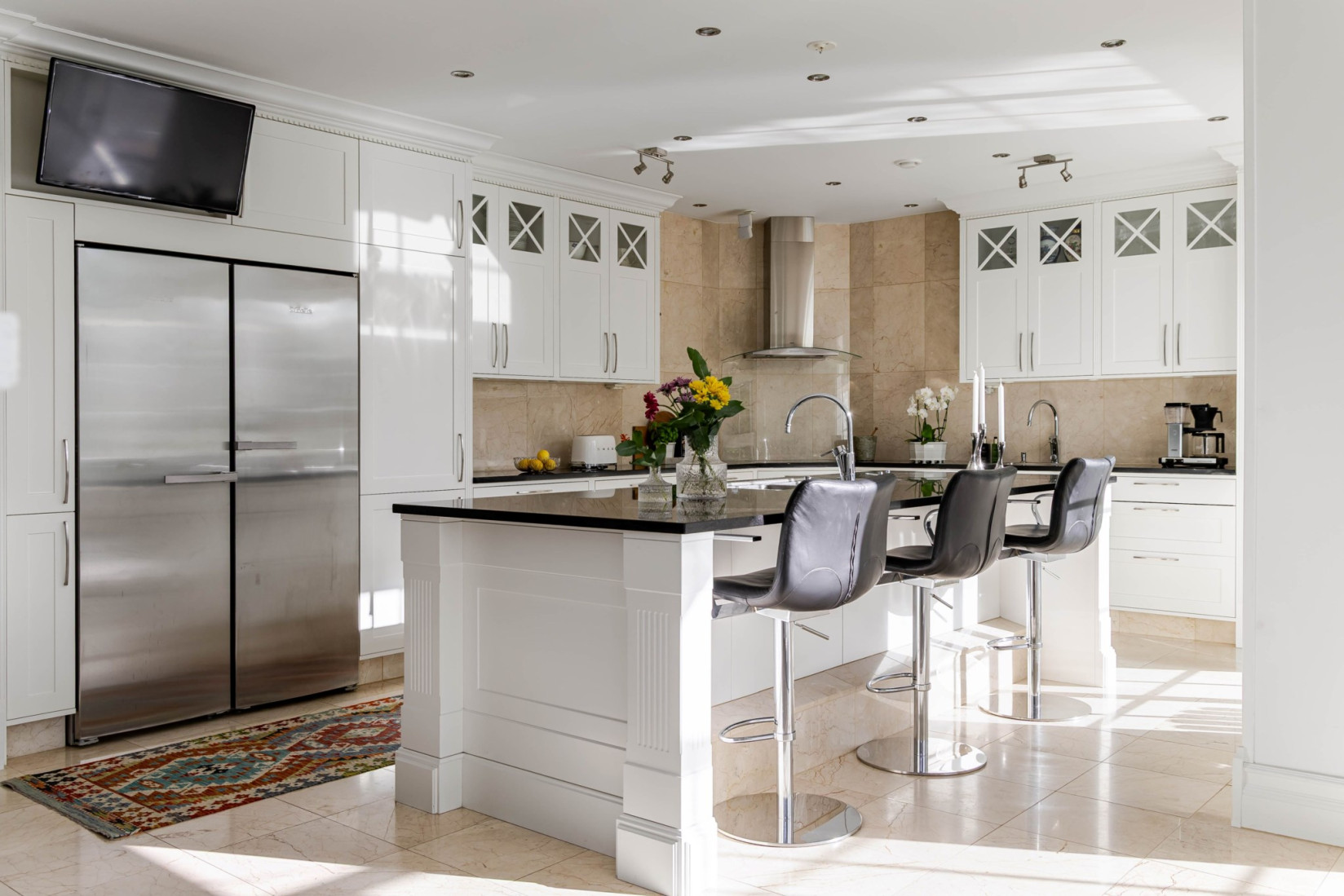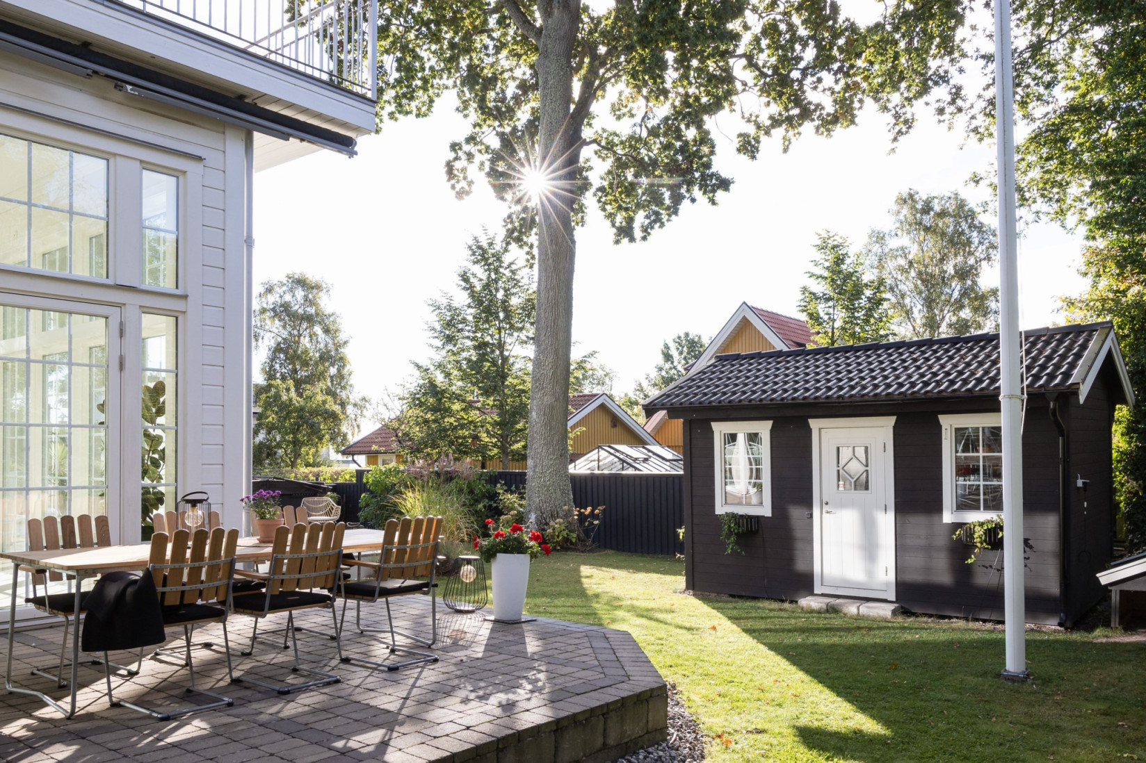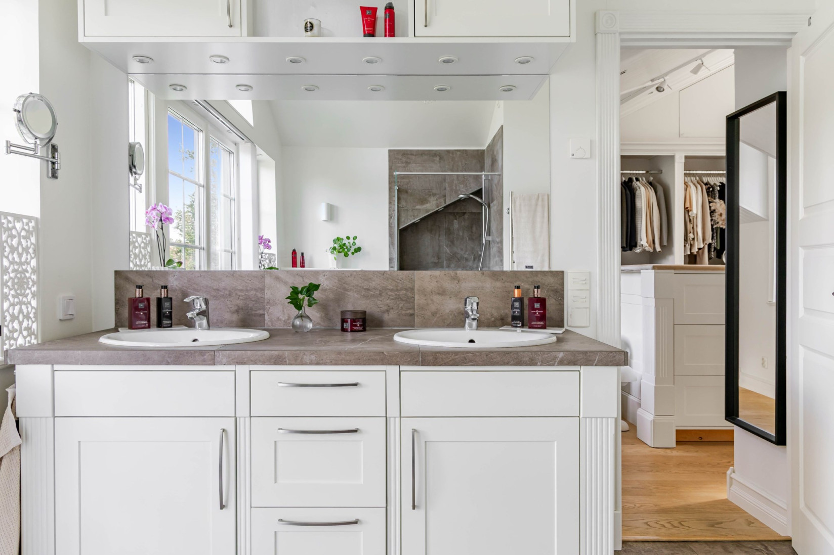 Från hallen leds man in i hjärtat av huset. Här möts kök, matsal och vardagsrum i en öppen planlösning som andas både gemenskap och elegans. Köket från Vicklebykök är gnistrande vitt med arbetsytor i mörk indisk granit som både för tankarna till exklusivitet och tidlöshet. Den rymliga köksön bjuder in till samtal och sällskap under matlagningen, och med dubbla ugnar, dubbla kylar och frysar samt dubbla vaskar finns all funktion man kan önska även för den kräsna kocken. De rostfria vitvarorna från Miele speglar ljuset och kompletterar den sobra helheten.
