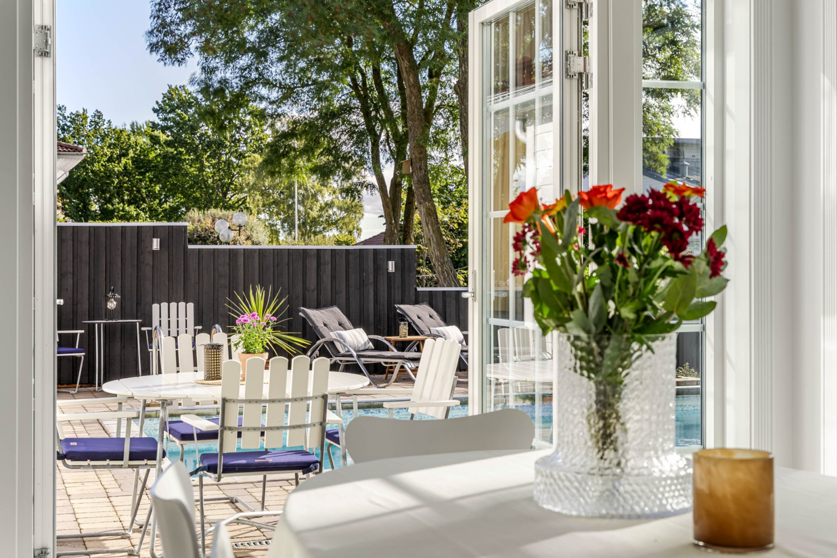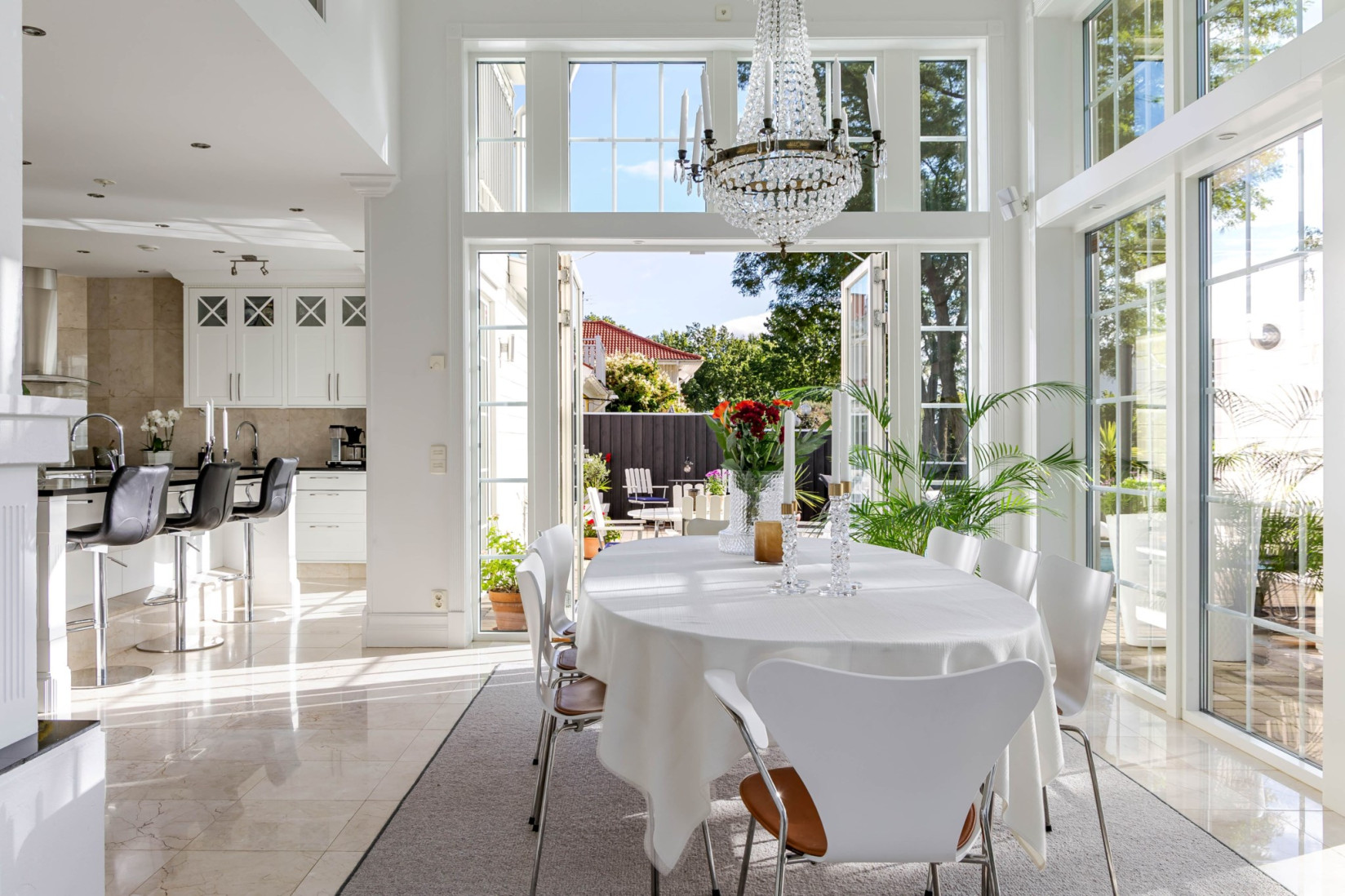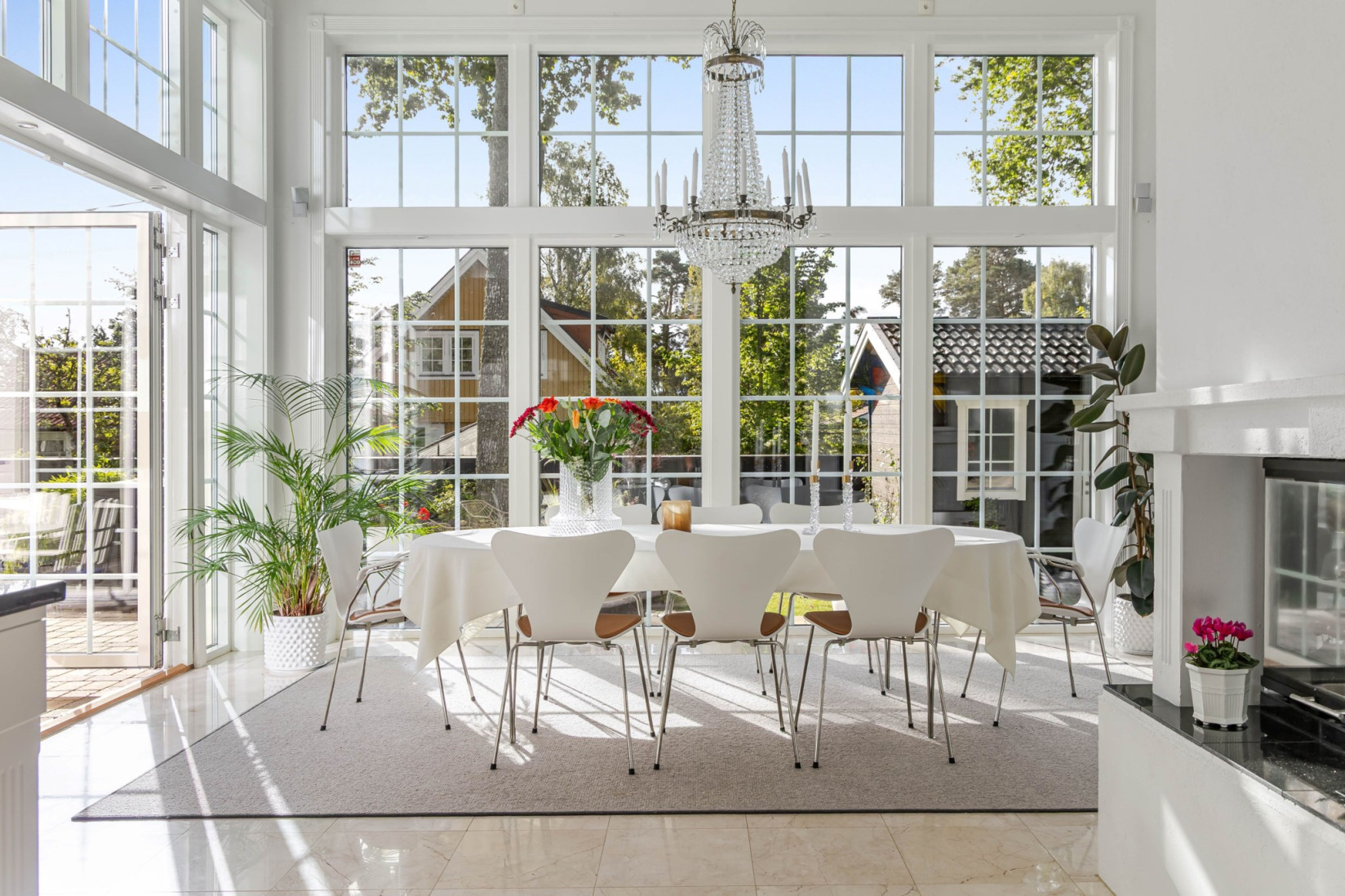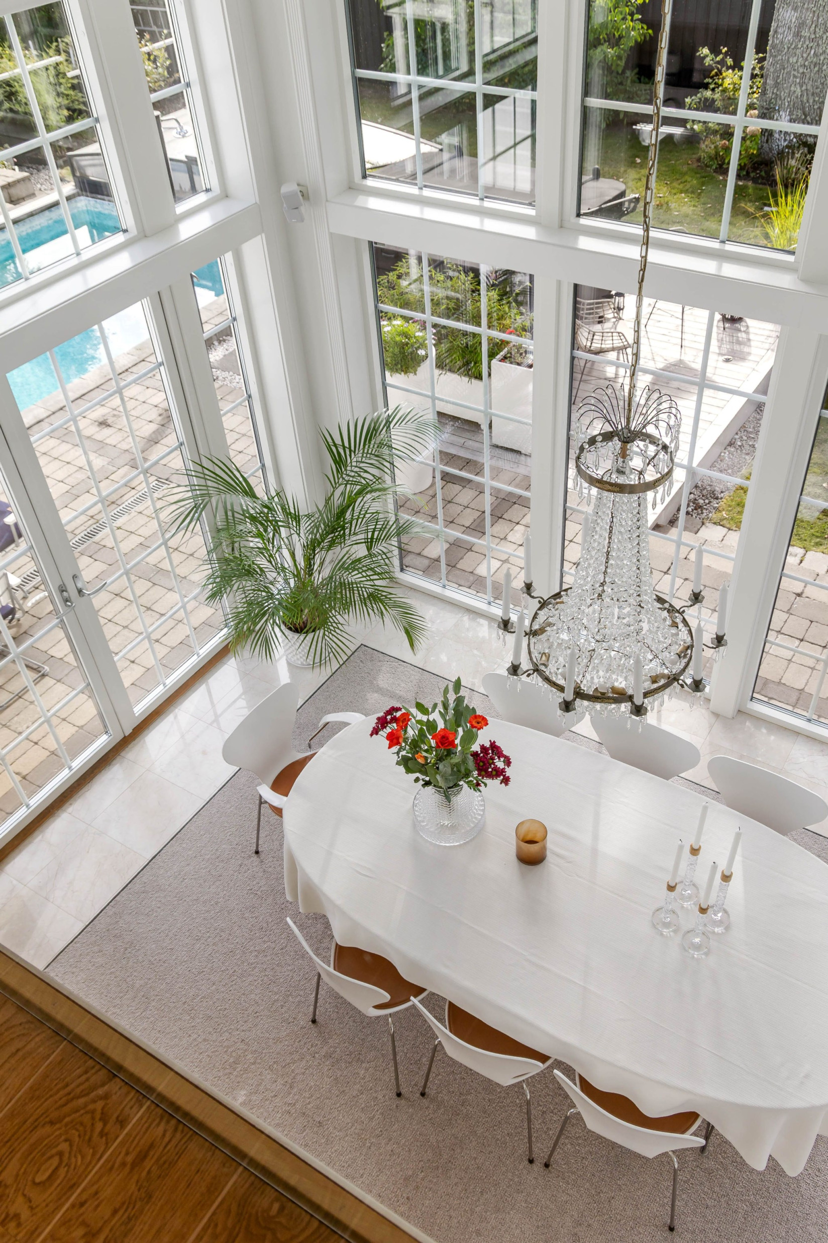 Matsalen, som reser sig med över fyra meter i takhöjd och omges av spröjsade fönster från golv till tak är något alldeles särskilt. Här får varje måltid en inramning av ljus, skiftande himlar och utsikten mot poolen och trädgården som glimtar genom glaspartierna. Ett långbord för tolv personer ryms med lätthet och sommartid öppnas dörrarna så att inne och ute flyter samman.