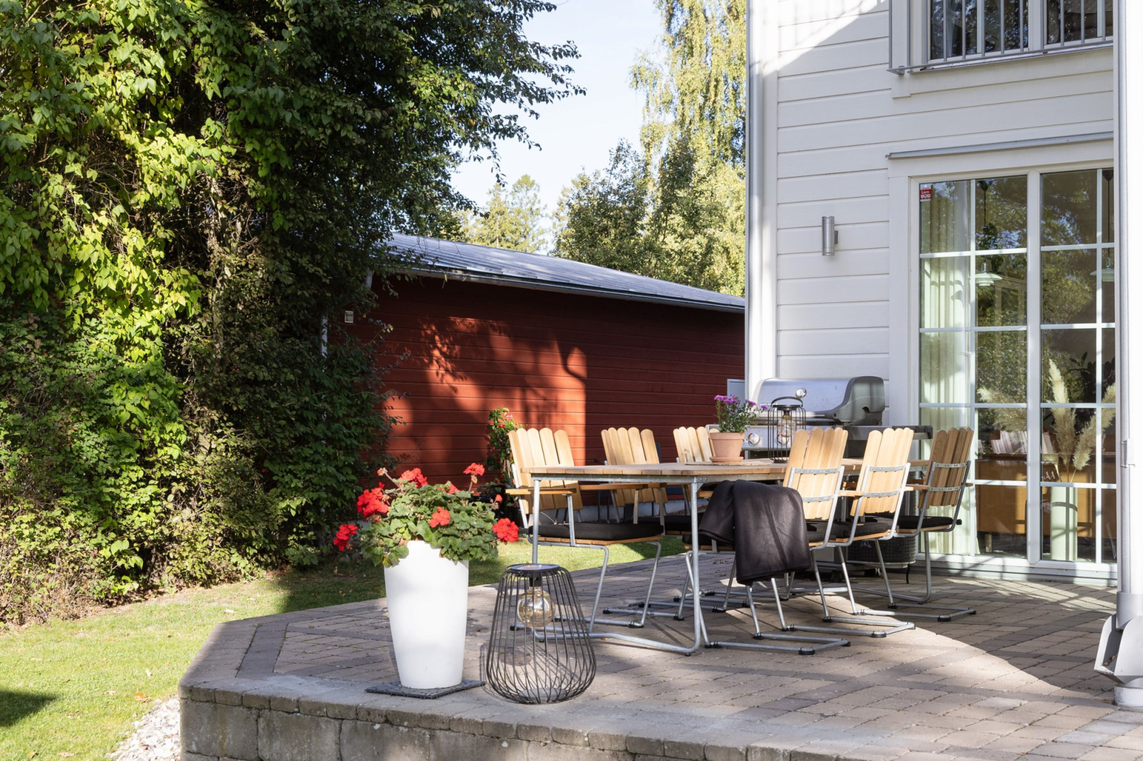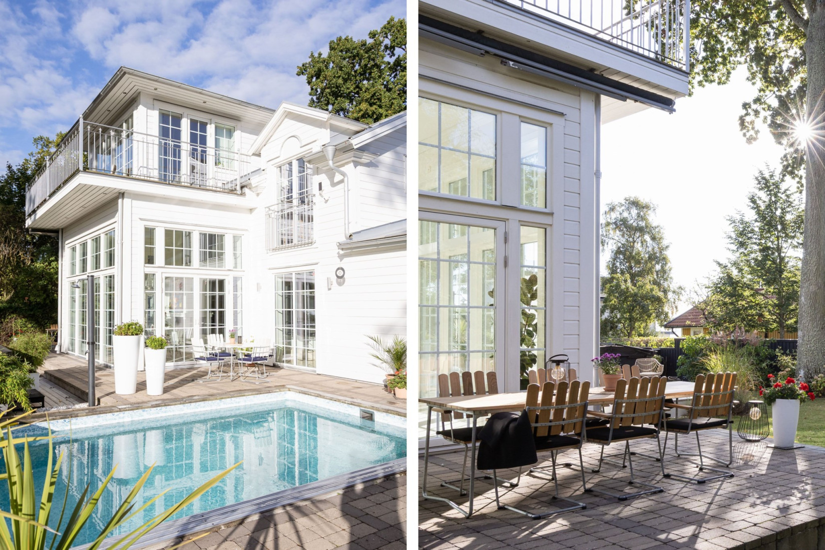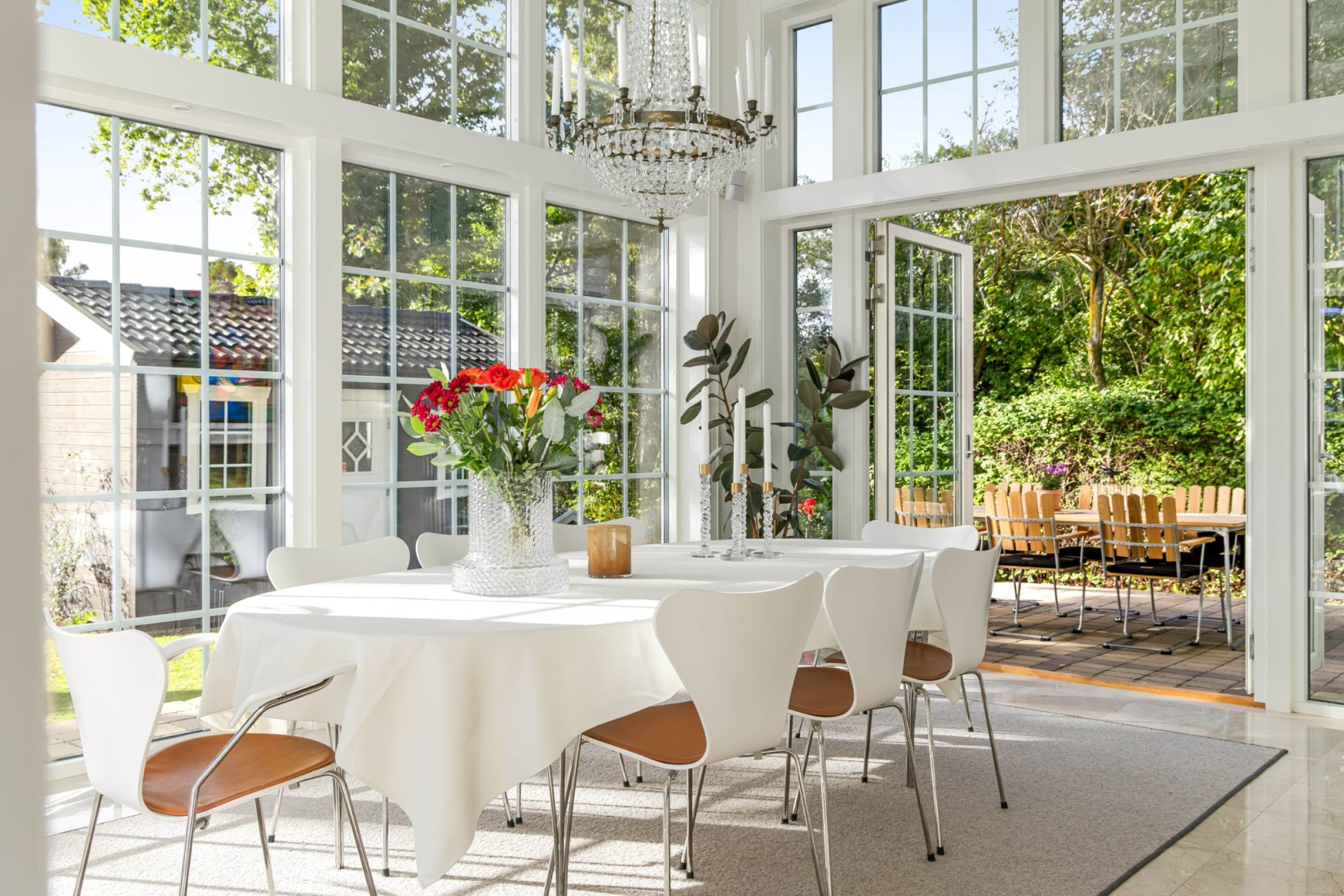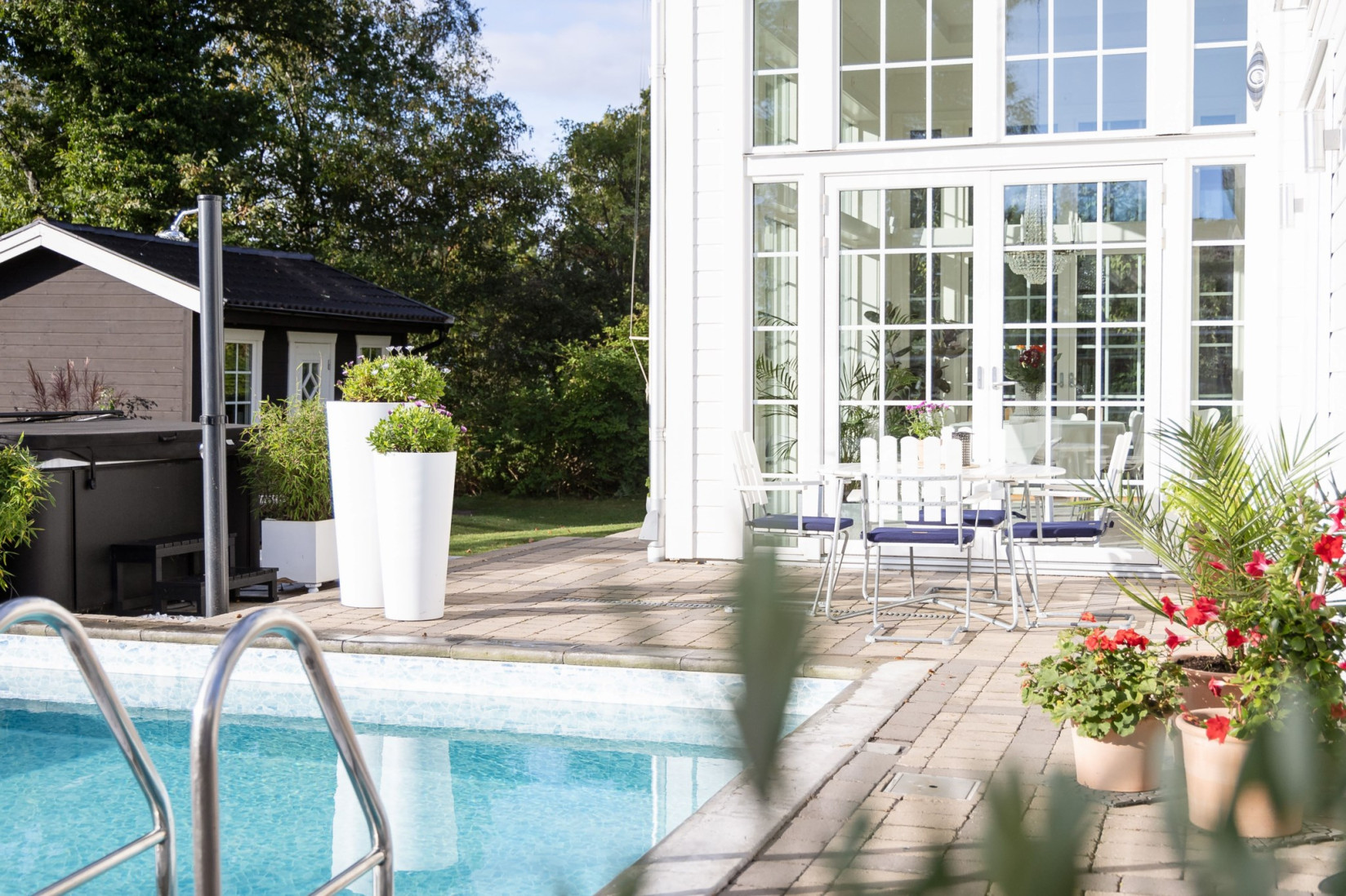 Matsalen, som reser sig med över fyra meter i takhöjd och omges av spröjsade fönster från golv till tak är något alldeles särskilt. Här får varje måltid en inramning av ljus, skiftande himlar och utsikten mot poolen och trädgården som glimtar genom glaspartierna. Ett långbord för tolv personer ryms med lätthet och sommartid öppnas dörrarna så att inne och ute flyter samman.