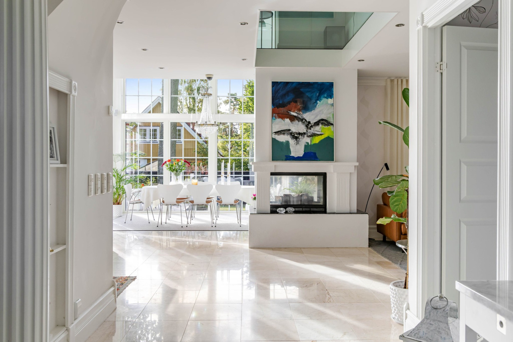 Golvet under fötterna är av spansk marmor, uppvärmt och behagligt, och sträcker sig genom hela bottenplanet som en skimrande bas för hemmets alla rum.