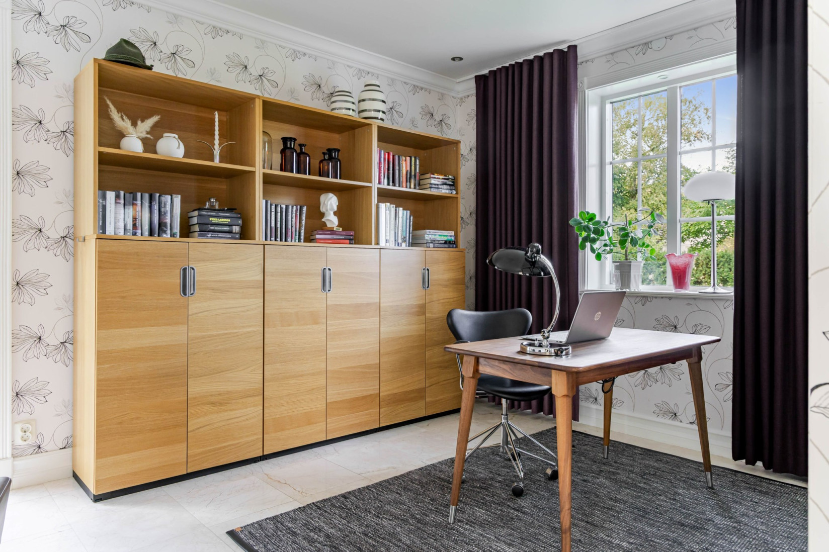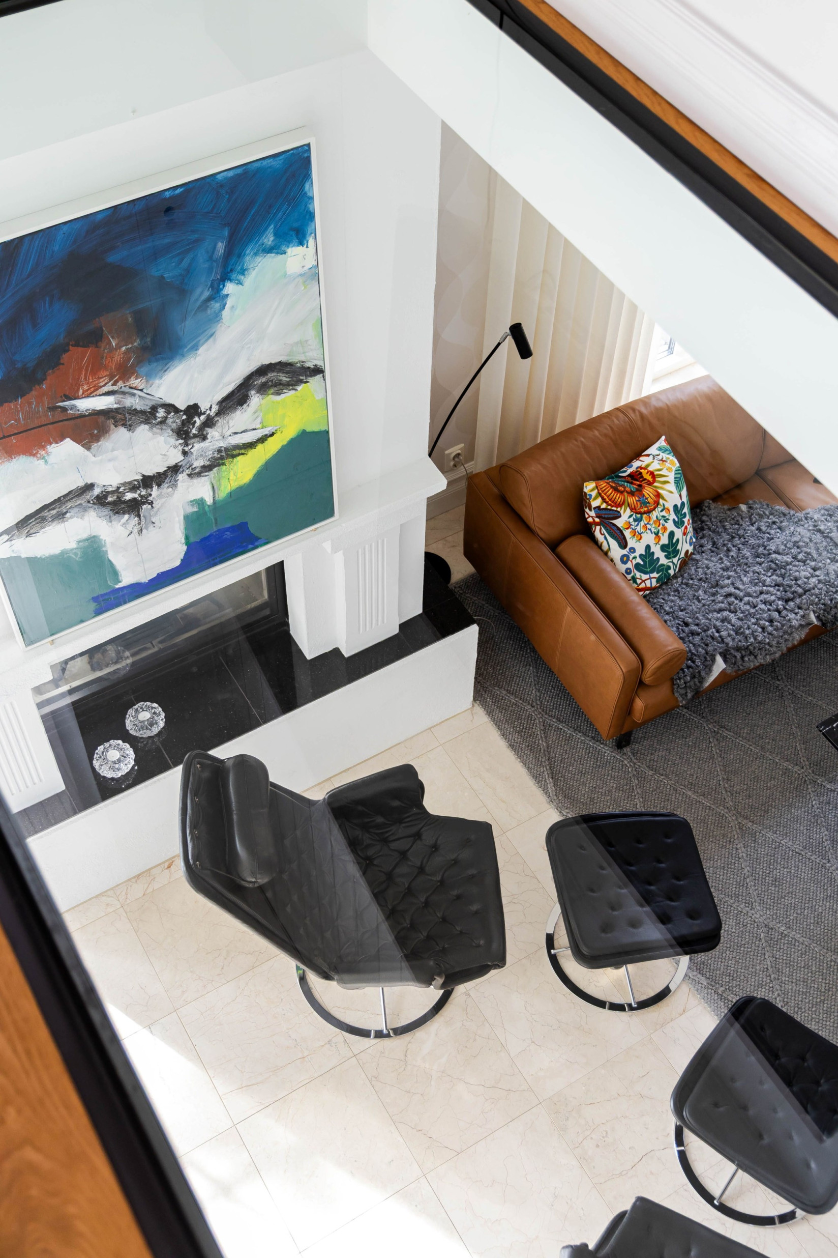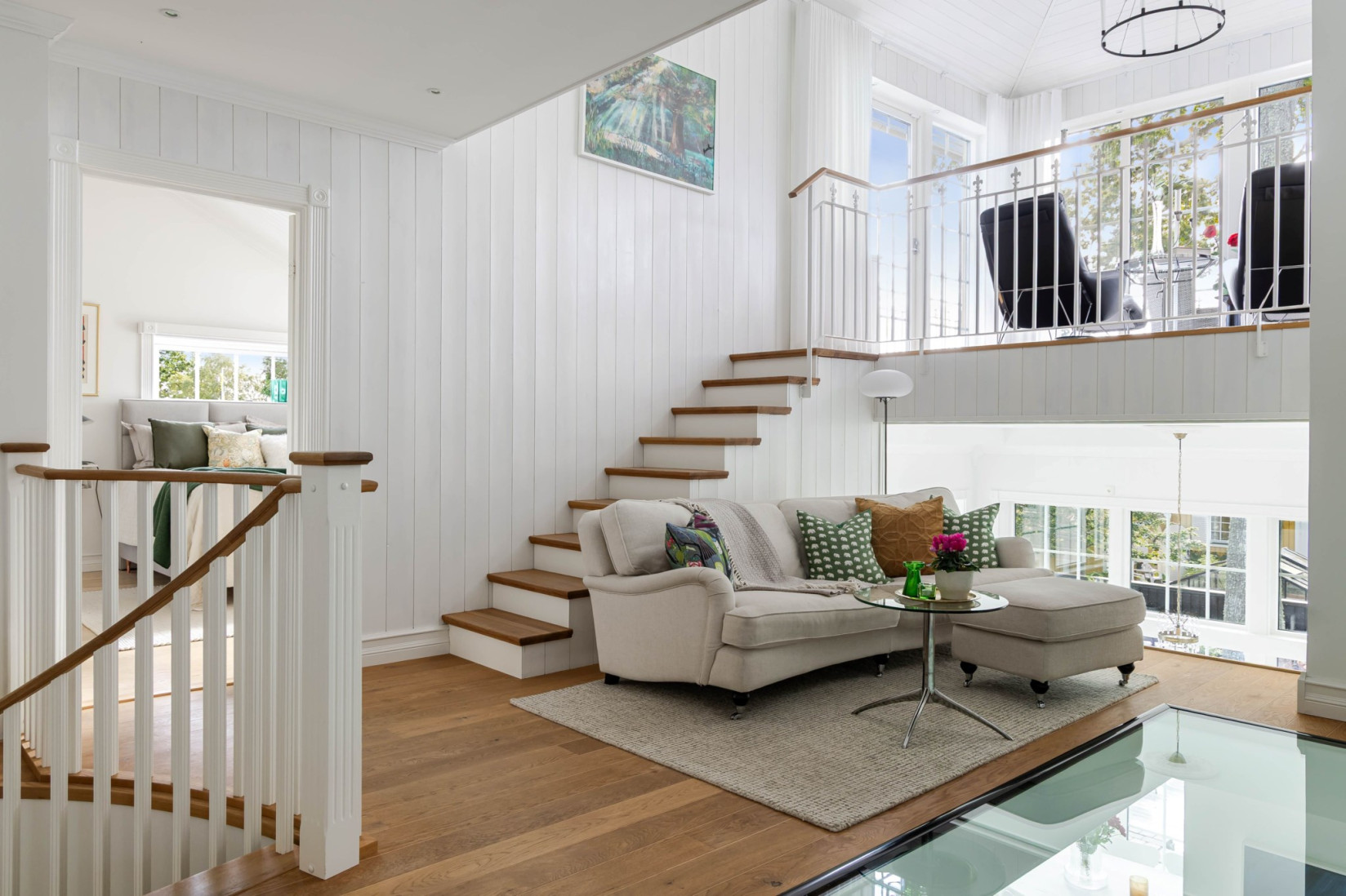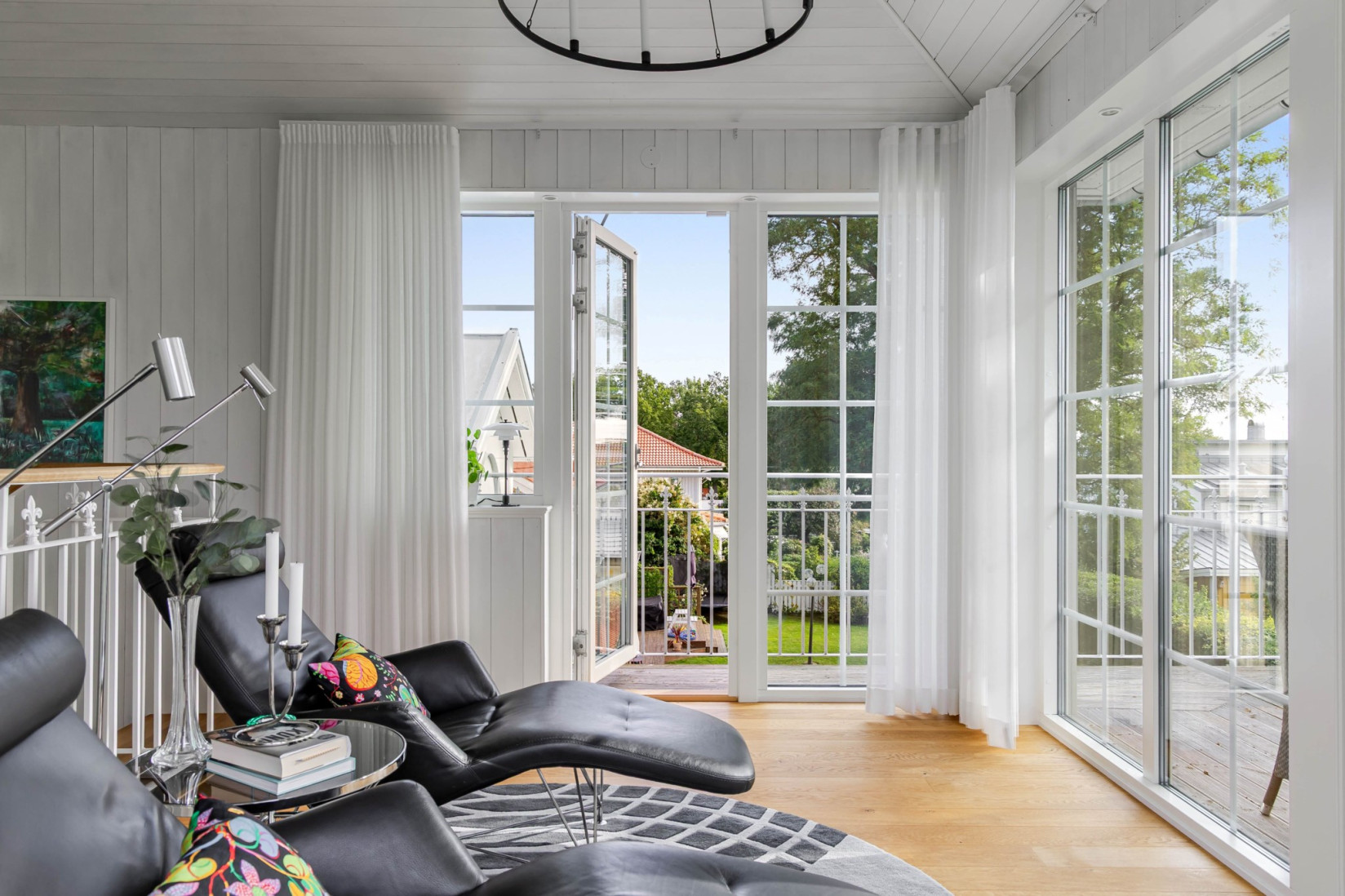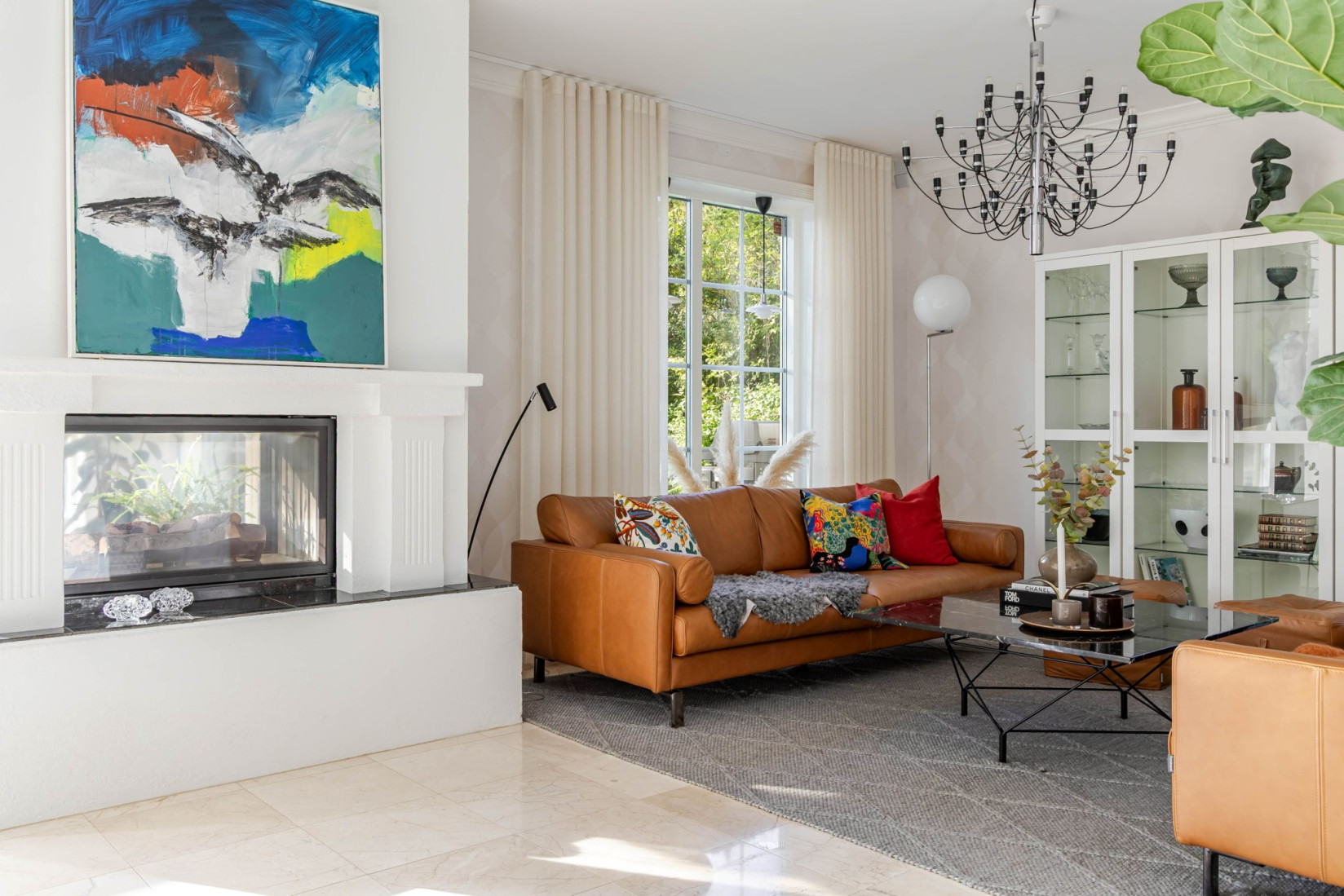 Vardagsrummet är generöst tilltaget och präglas av ljus och rymd. Blicken dras ofta uppåt mot glaspartiet i taket där övervåningen blir en del av rummet. Här är det lätt att föreställa sig vinterkvällar vid elden och sommardagar med vidöppna dörrar ut mot trädgården.
