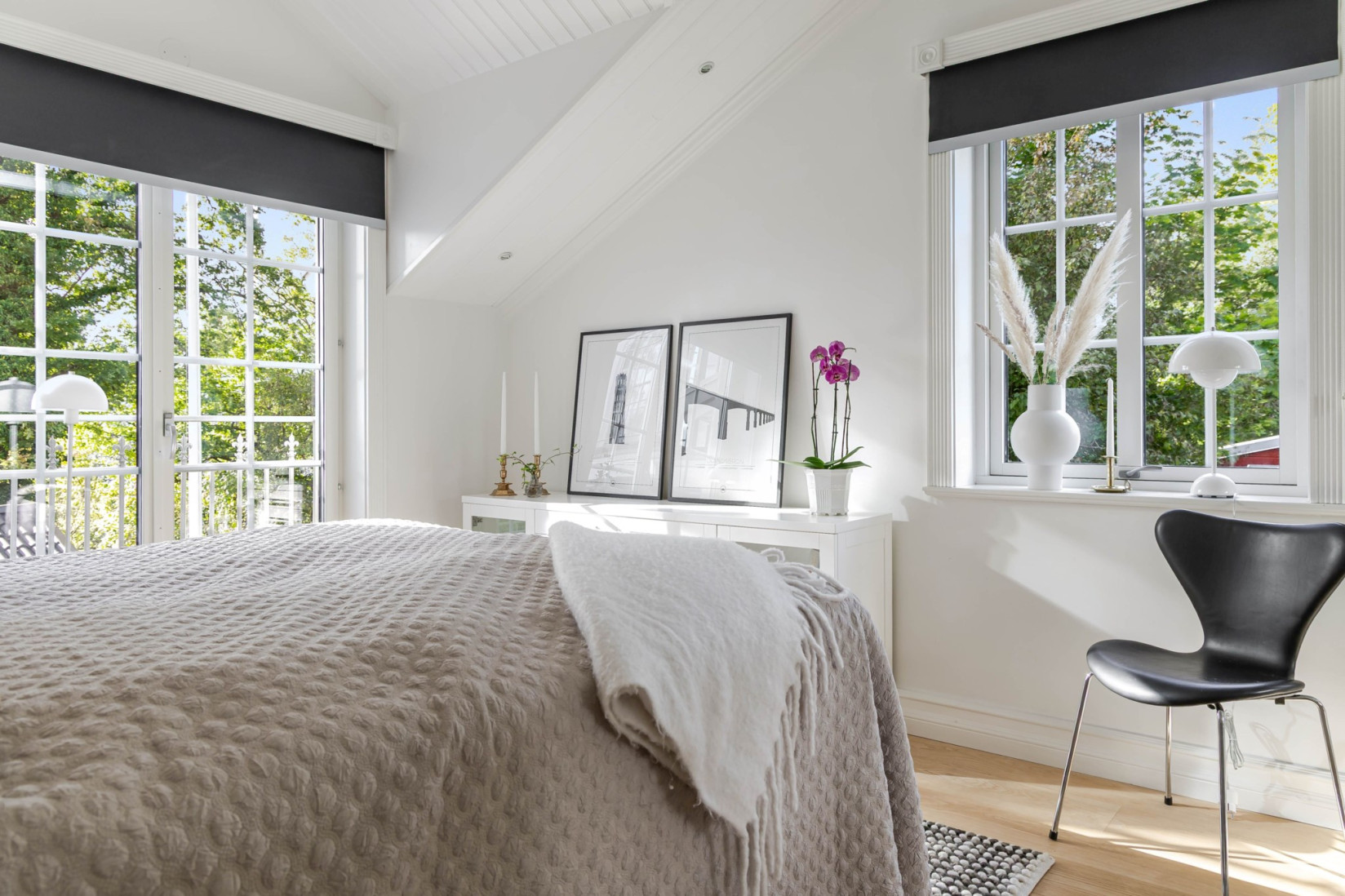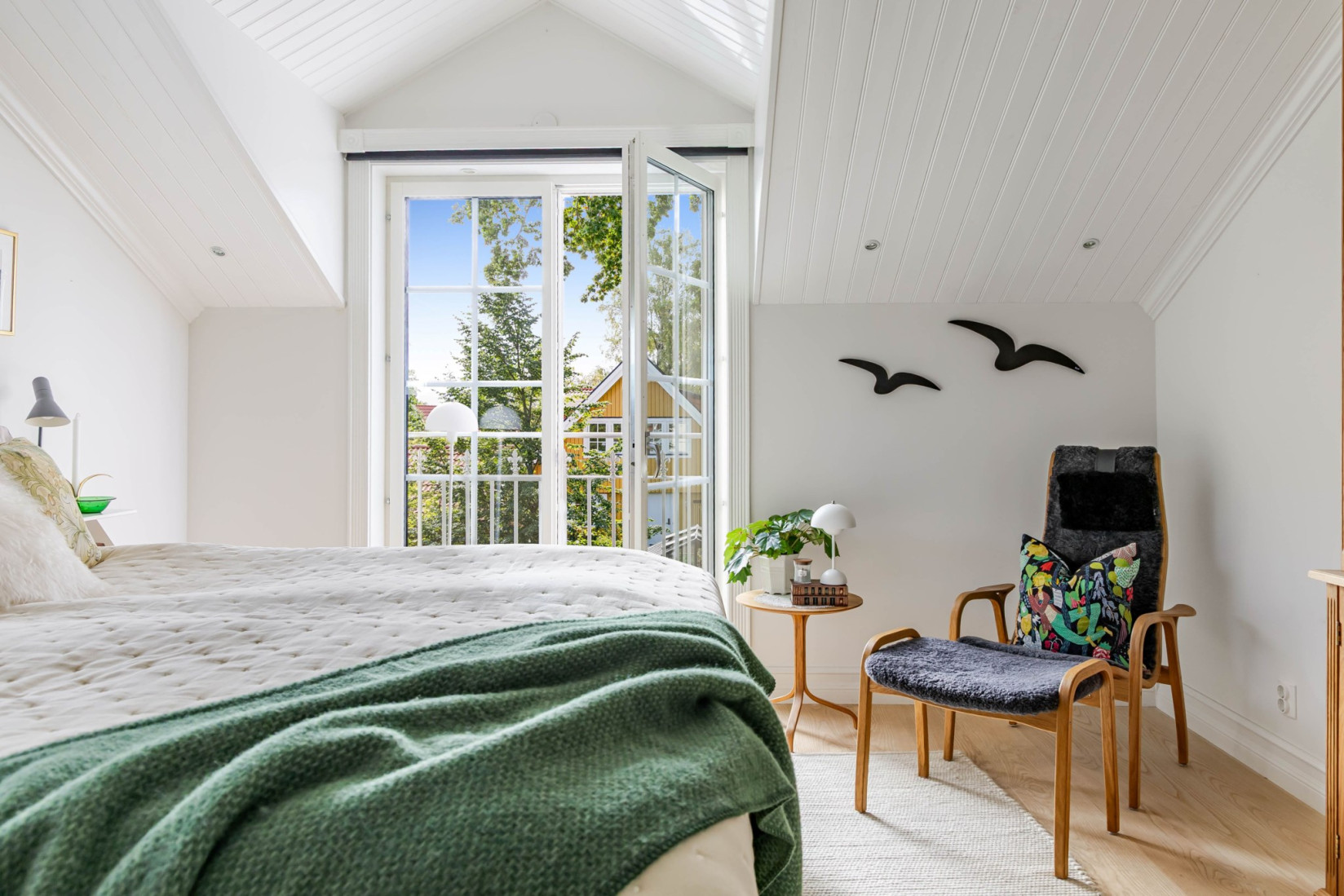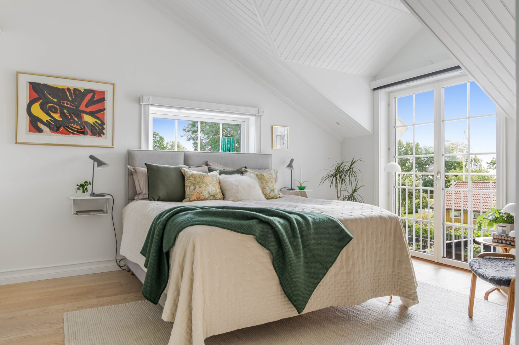 Övre plan rymmer också två sovrum med fönster i två väderstreck och stora skjutdörrsgarderober. Det ena har en fransk balkong och ett charmigt sovloft.