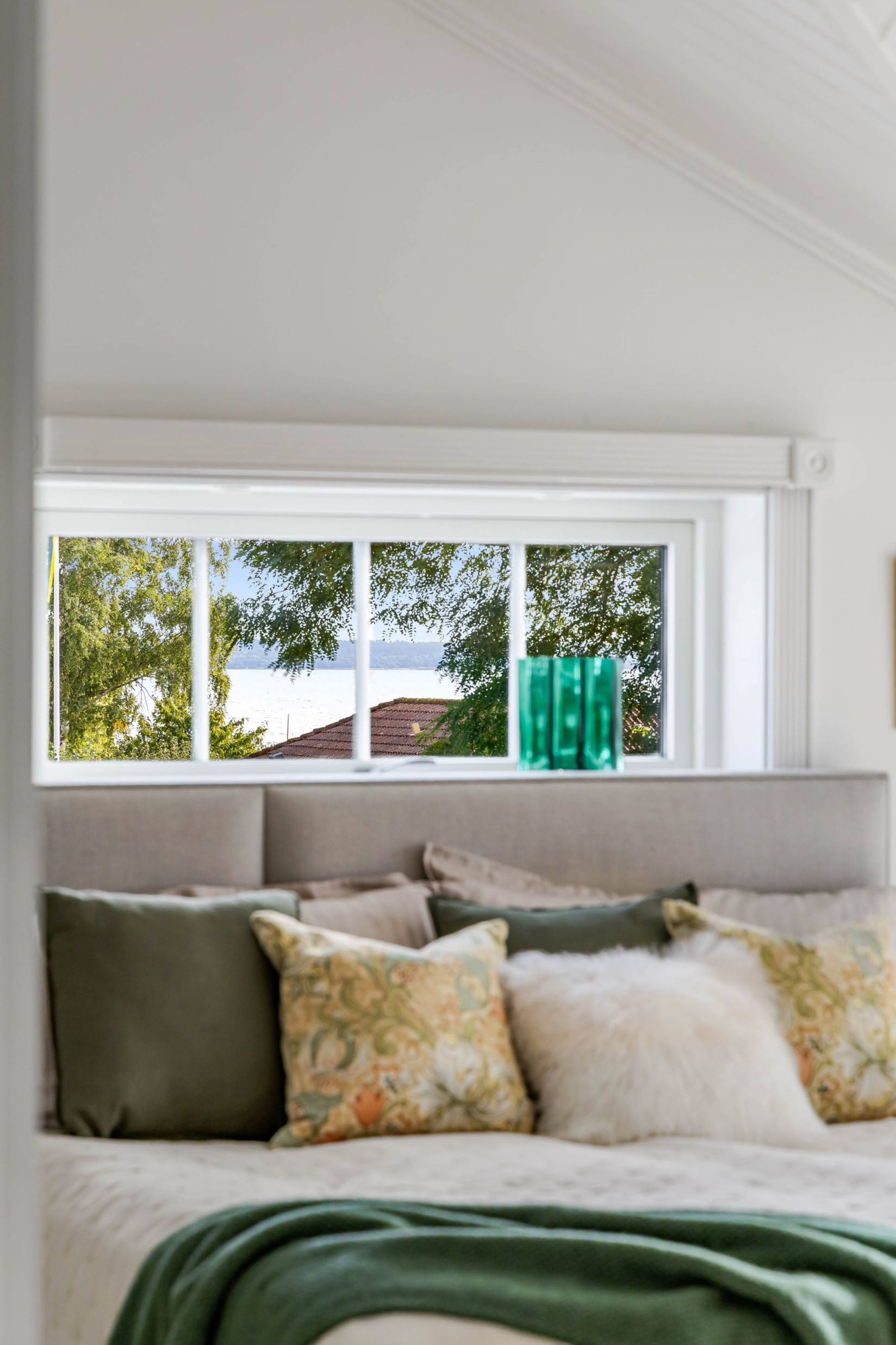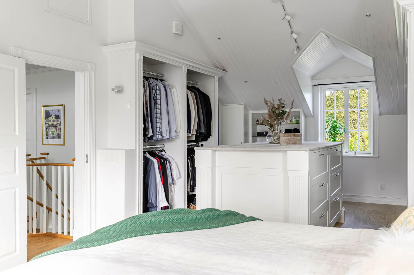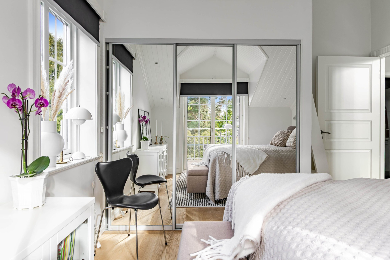 Övre plan rymmer också två sovrum med fönster i två väderstreck och stora skjutdörrsgarderober. Det ena har en fransk balkong och ett charmigt sovloft.