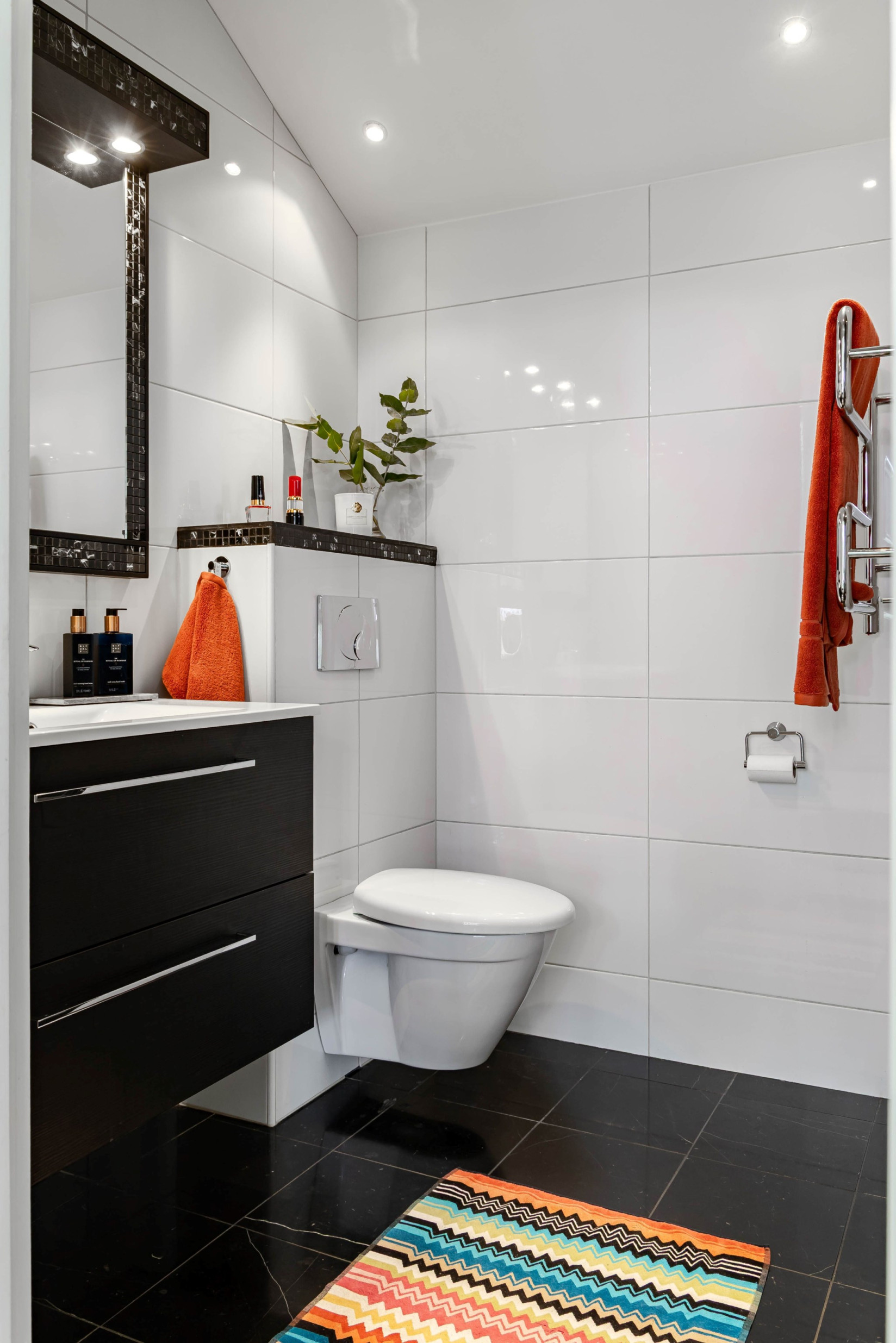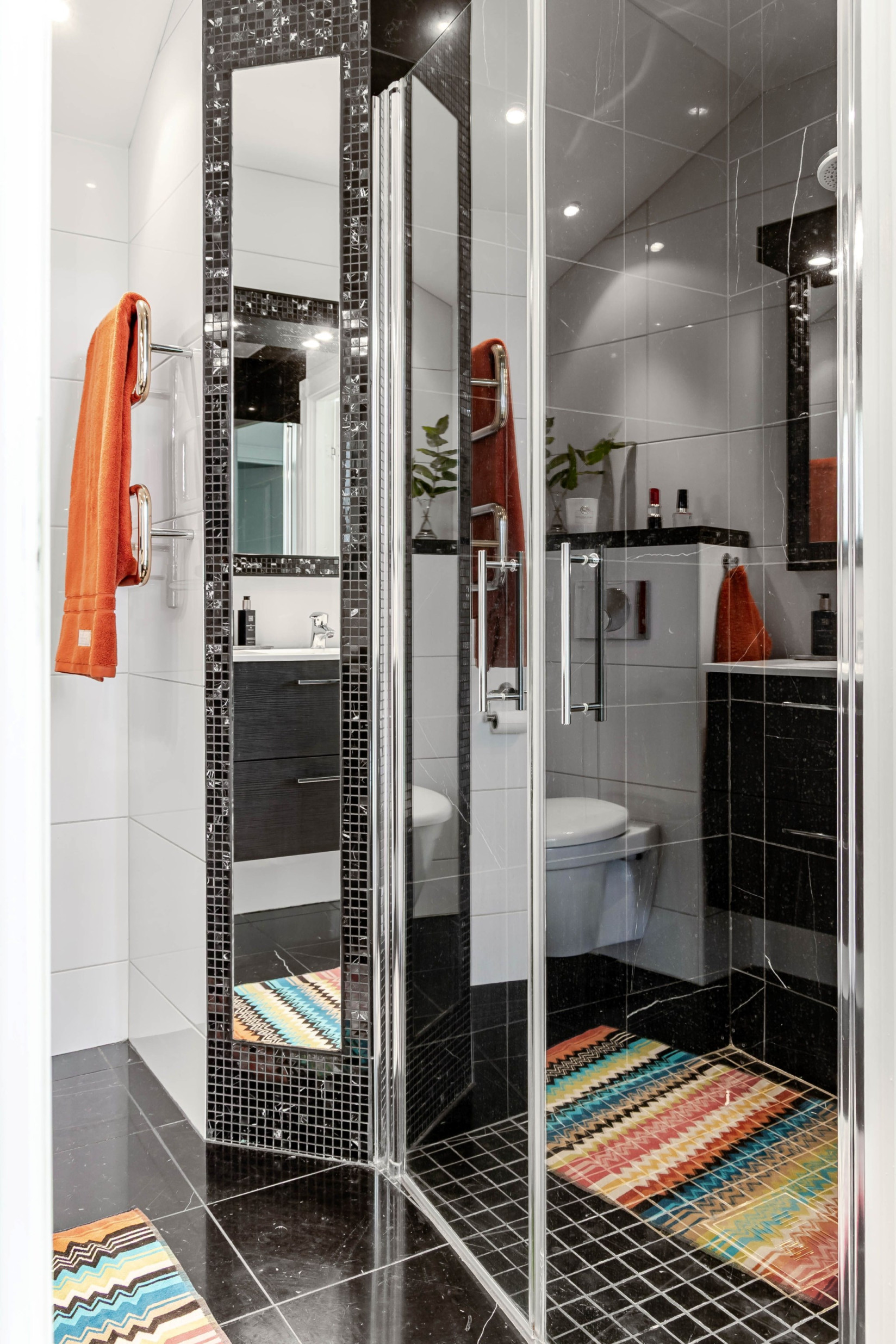 I anslutning till dessa två sovrum ligger ett helkaklat badrum med dusch, smakfullt och modernt.