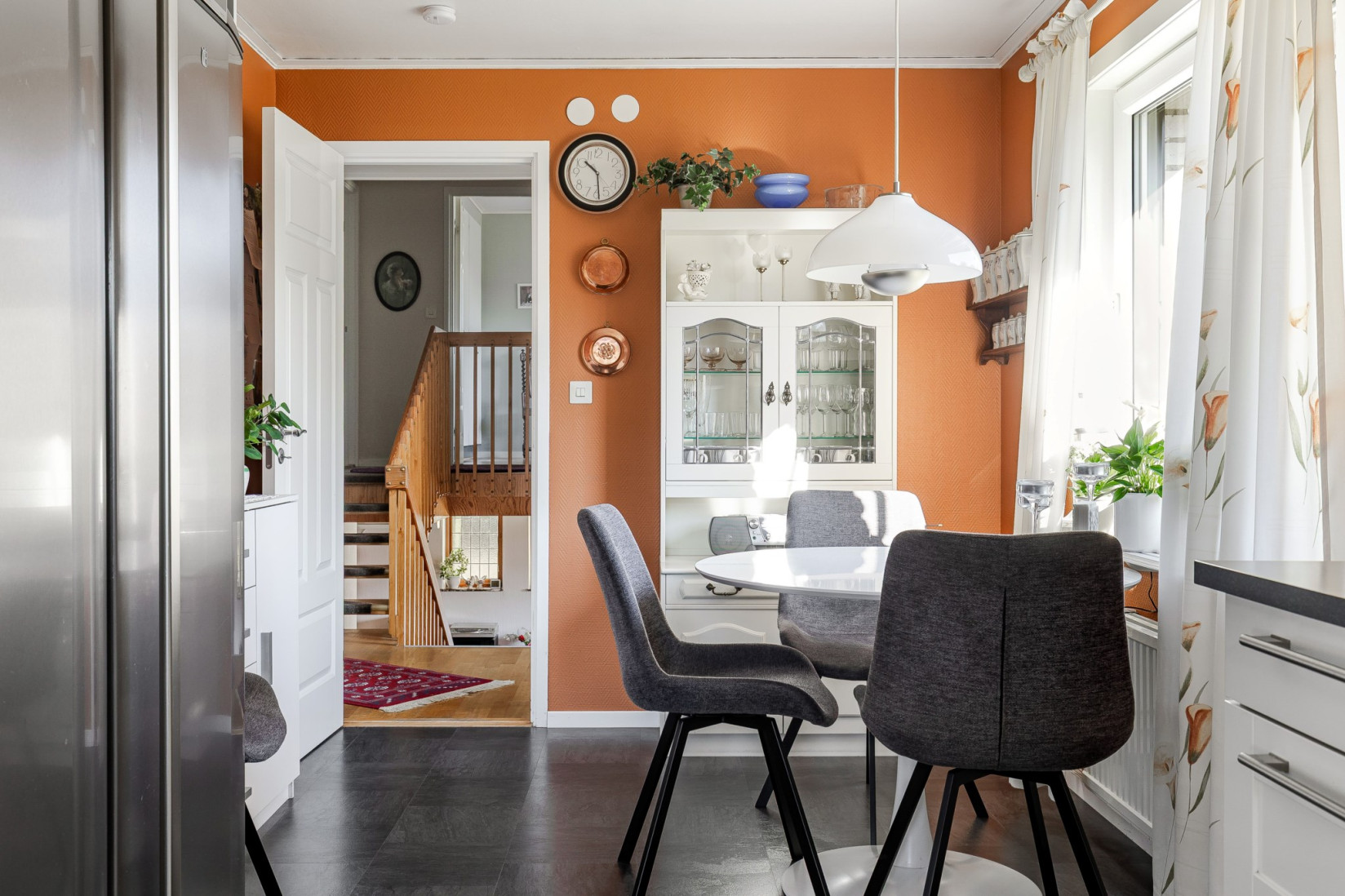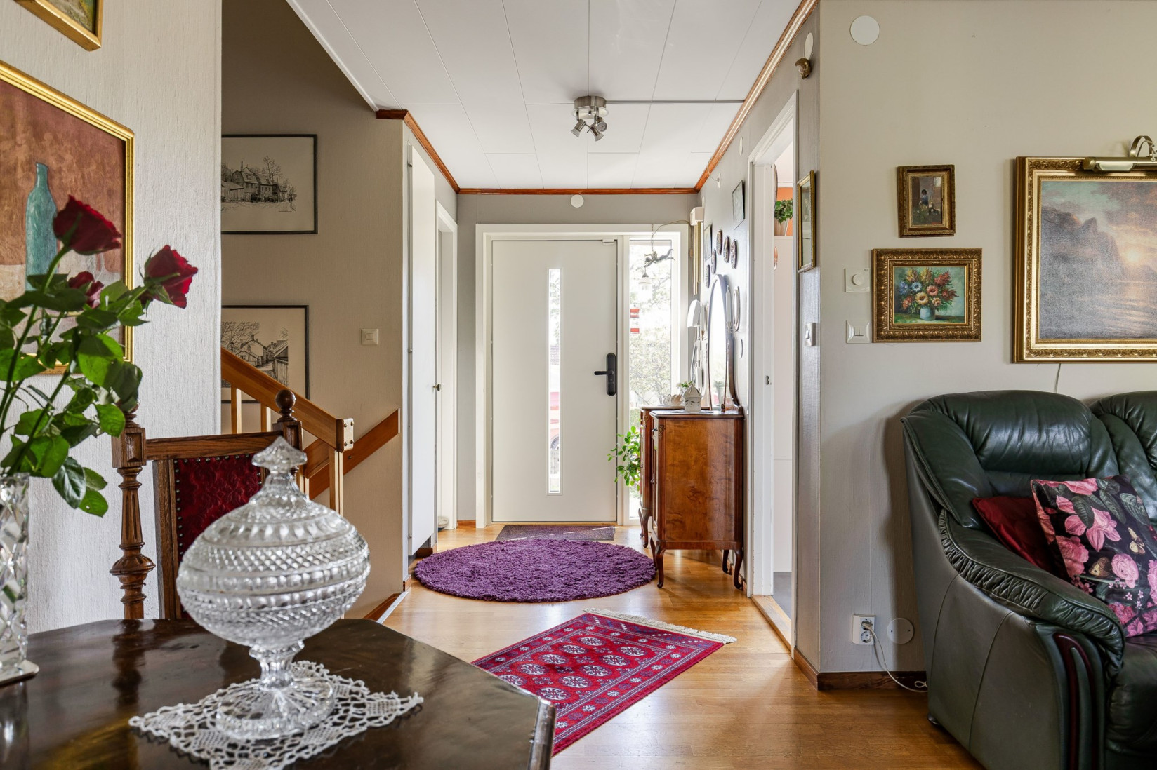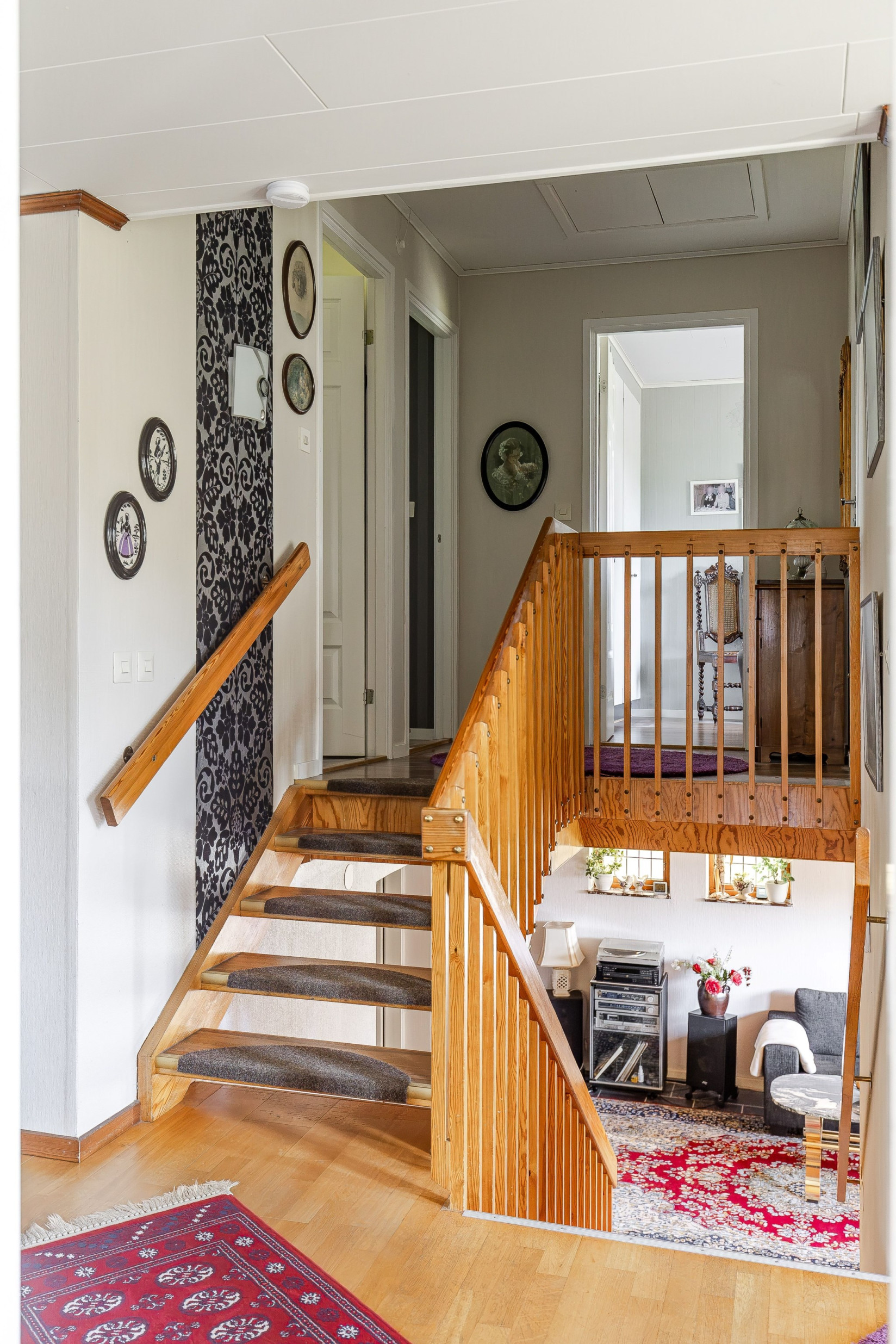 Man kliver in genom en välkomnande hall som direkt öppnar sig mot de sociala ytorna. Härifrån ser man hur huset vecklar ut sig. Köket med sin naturliga mittpunkt, vardagsrummet där ljuset ligger mjukt om eftermiddagen, och trappstegen som leder upp mot den mer privata delen.