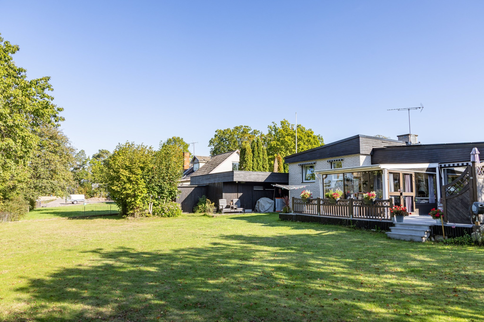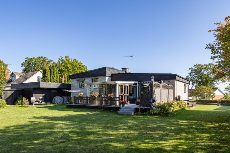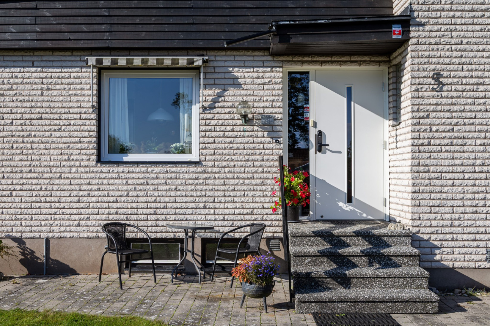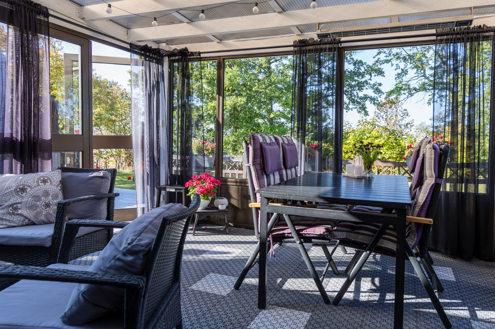 Utanför, bakom huset, väntar trädgården igen. Skyddad från insyn, inramad av grönska. Och när dörren från det inglasade uterummet ut till trädgården öppnas, blandas inomhus med utomhus. Doft av blommande växter, vinden som susar i träden bakom och kvällsljuset som faller snett över fasaden.