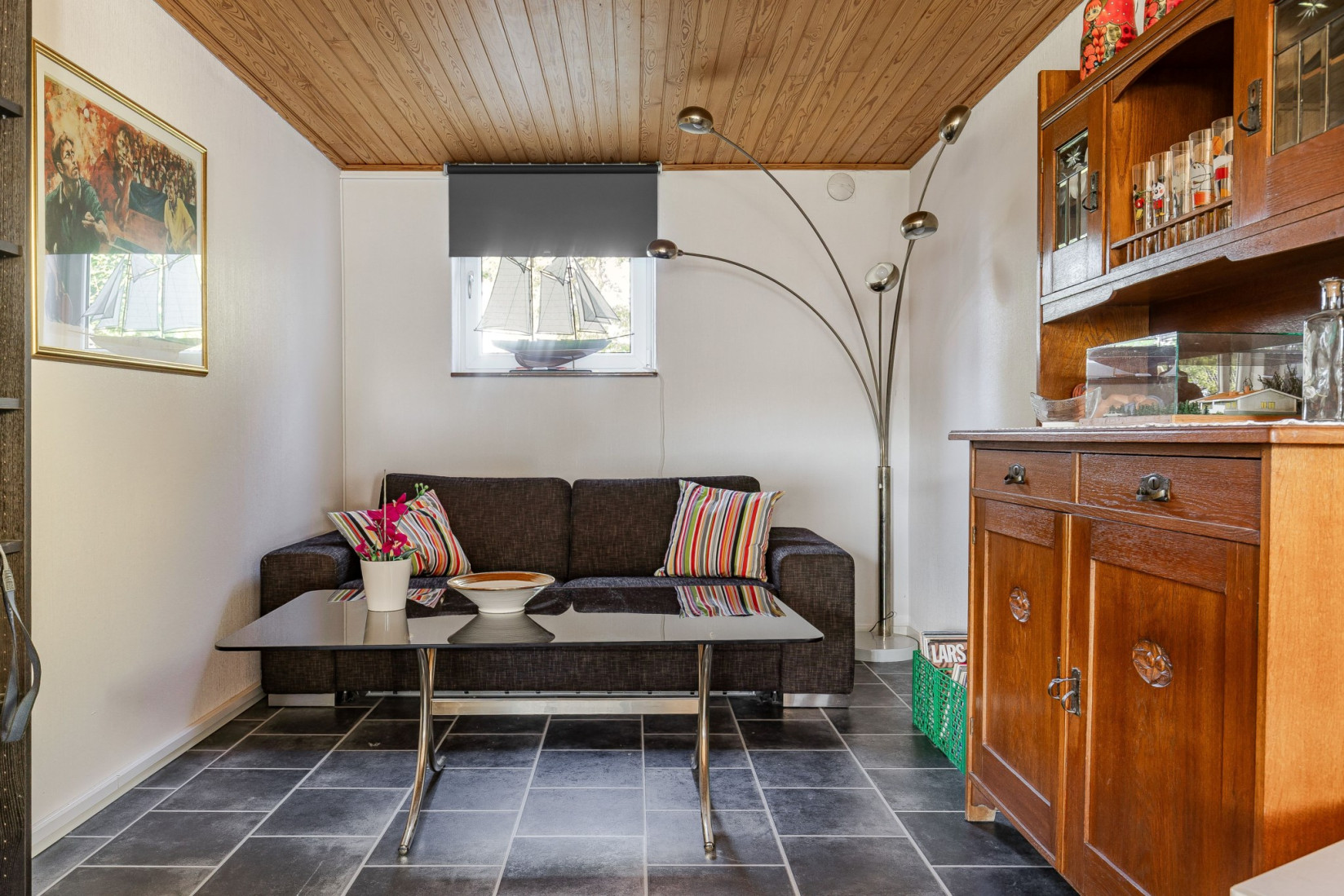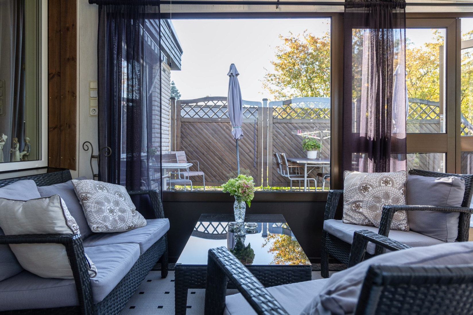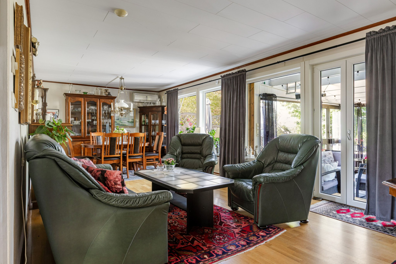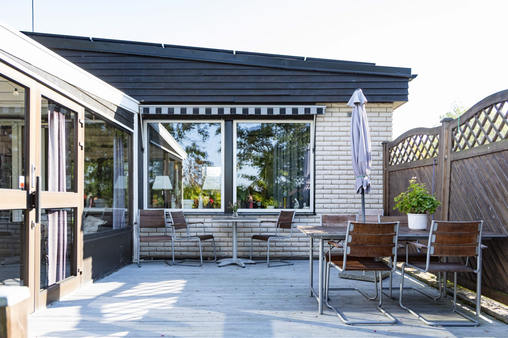 Utanför, bakom huset, väntar trädgården igen. Skyddad från insyn, inramad av grönska. Och när dörren från det inglasade uterummet ut till trädgården öppnas, blandas inomhus med utomhus. Doft av blommande växter, vinden som susar i träden bakom och kvällsljuset som faller snett över fasaden.