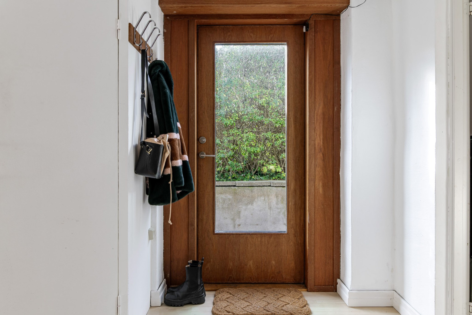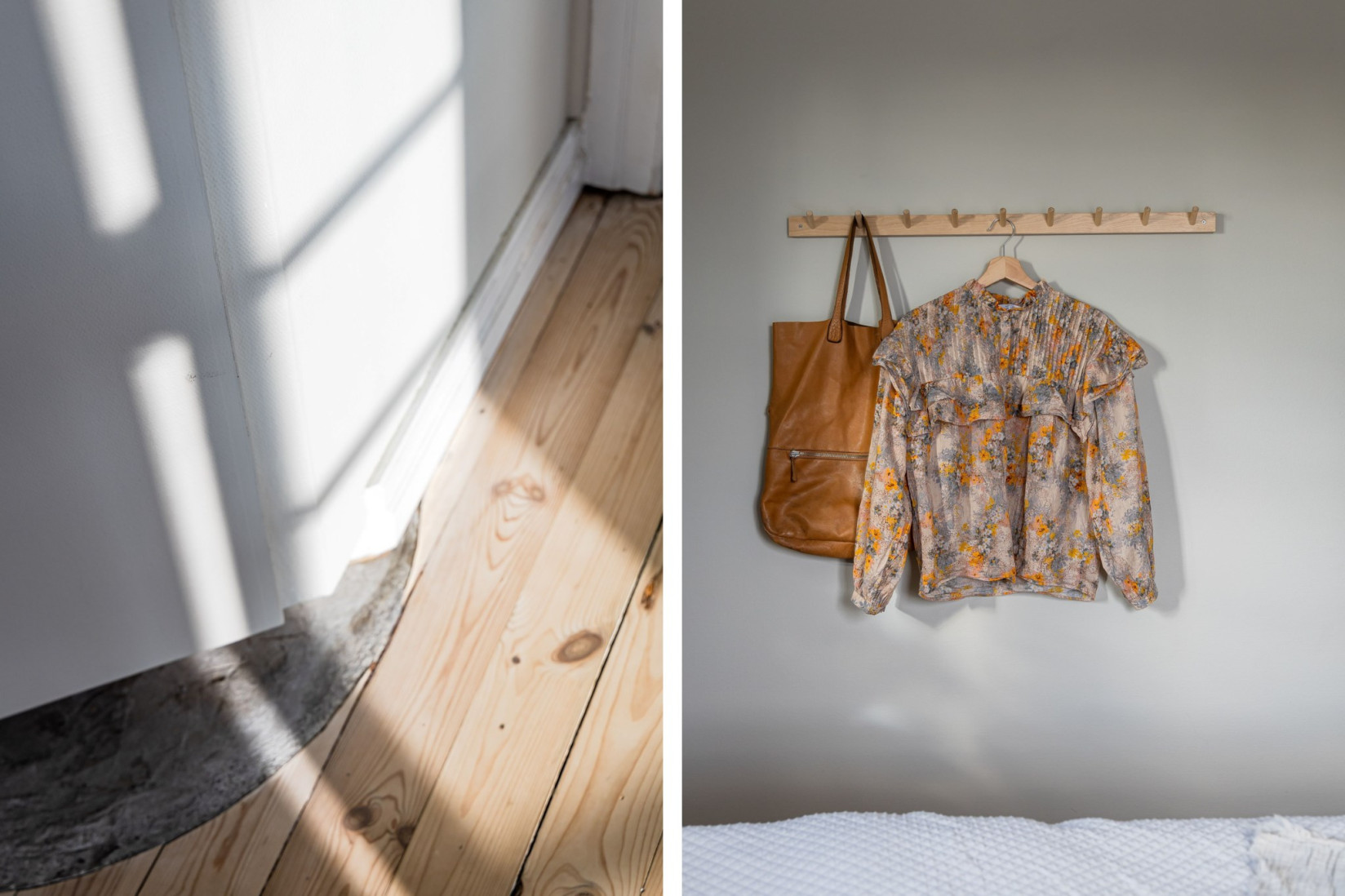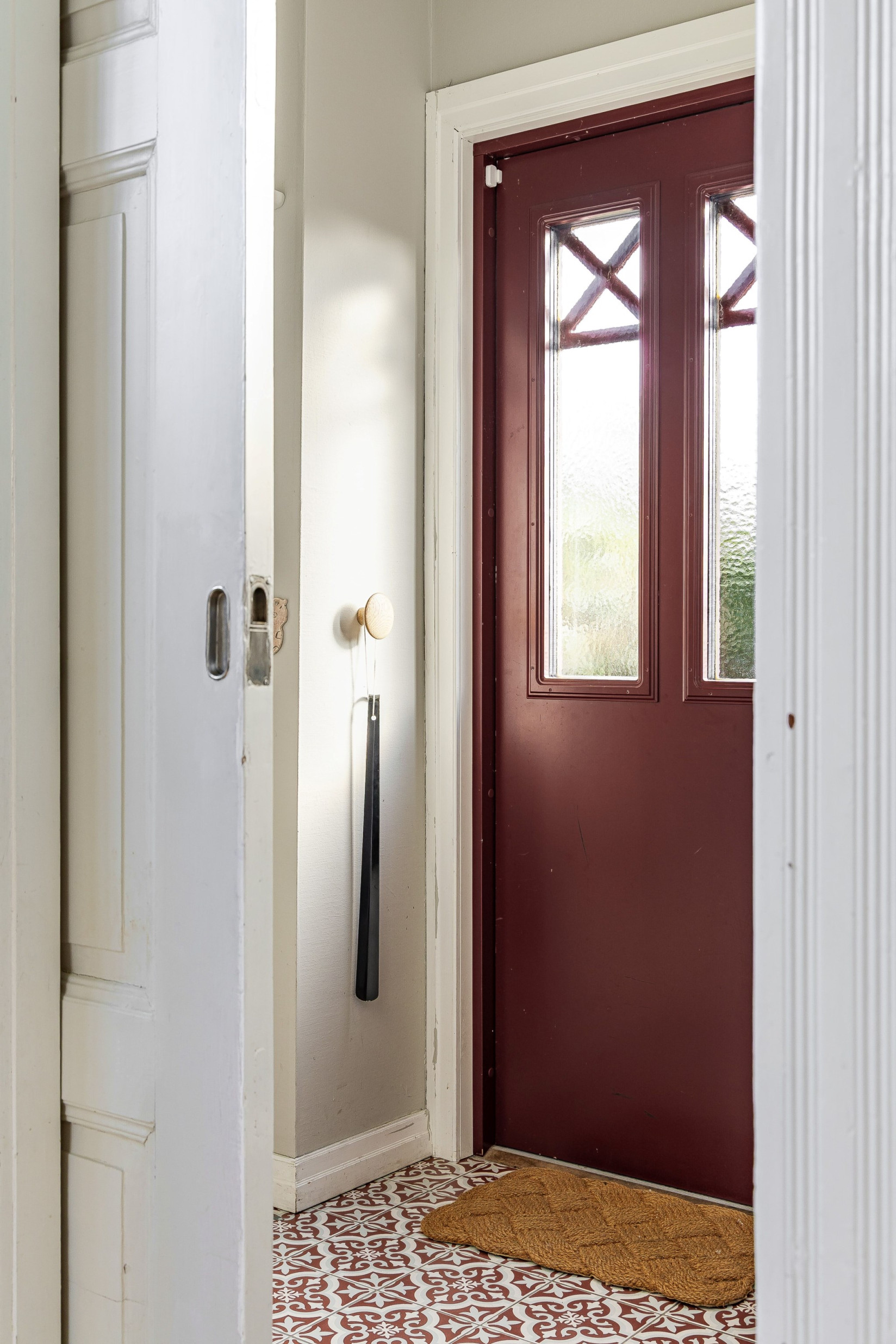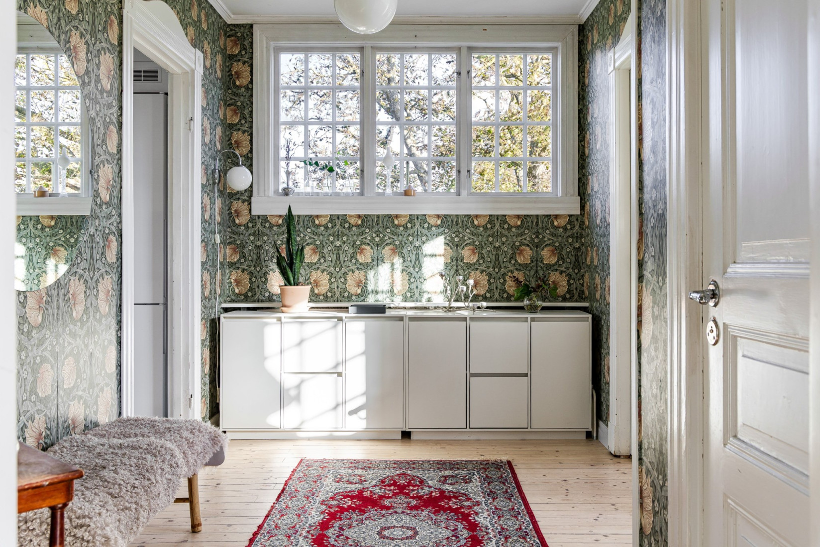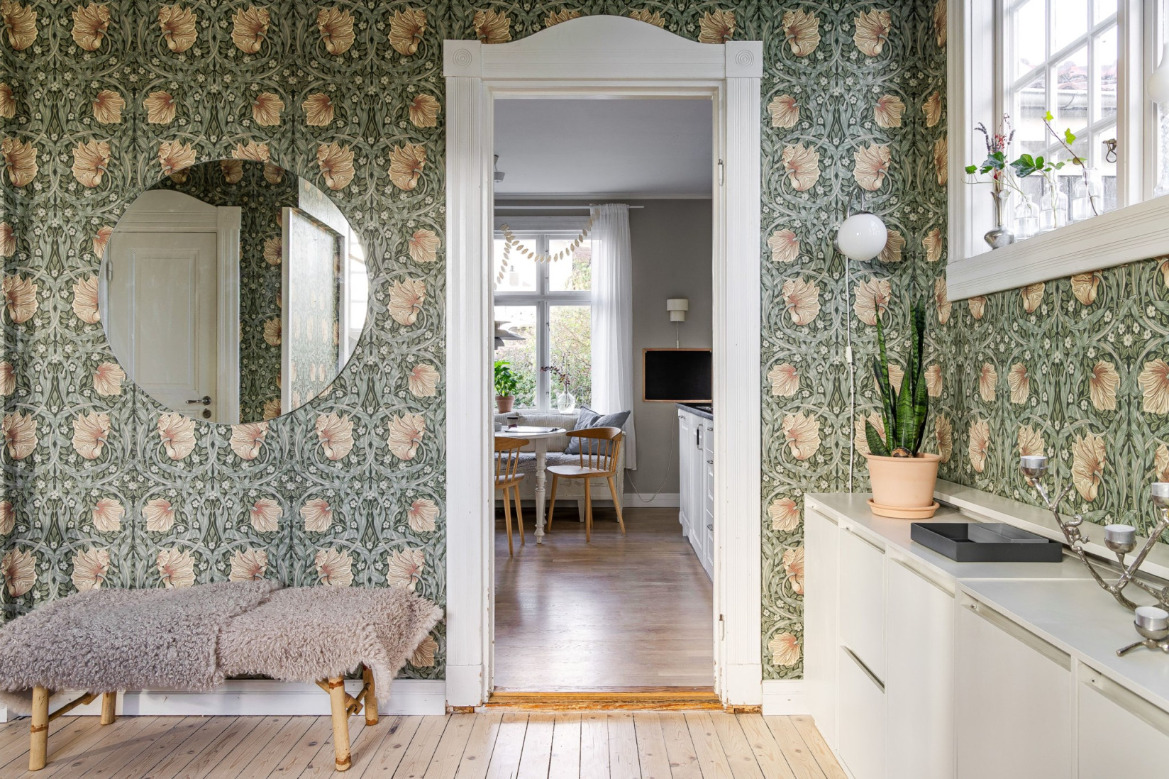 När du tar dig vidare upp för trappan välkomnas du av en hall som genast inger en härlig känsla. I tamburen hänger du av dig ytterkläderna, fötterna möter ett vackert klinkergolv innan du kliver in i den generösa hallen. Här samsas plankgolv med vacker tapet och spröjsade fönster som låter ljuset flöda in. Utrymmet ger gott om plats för möblemang eller förvaring.