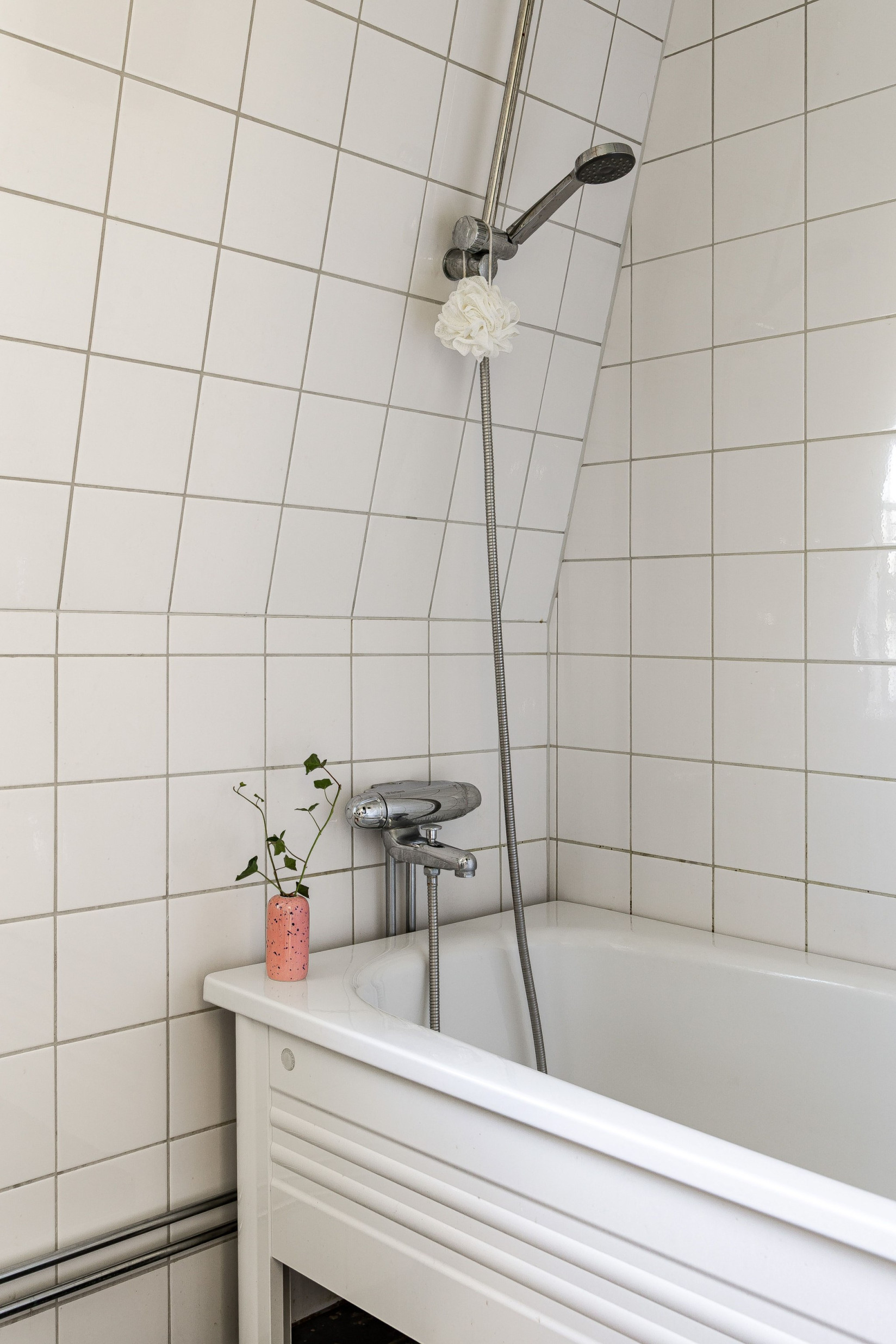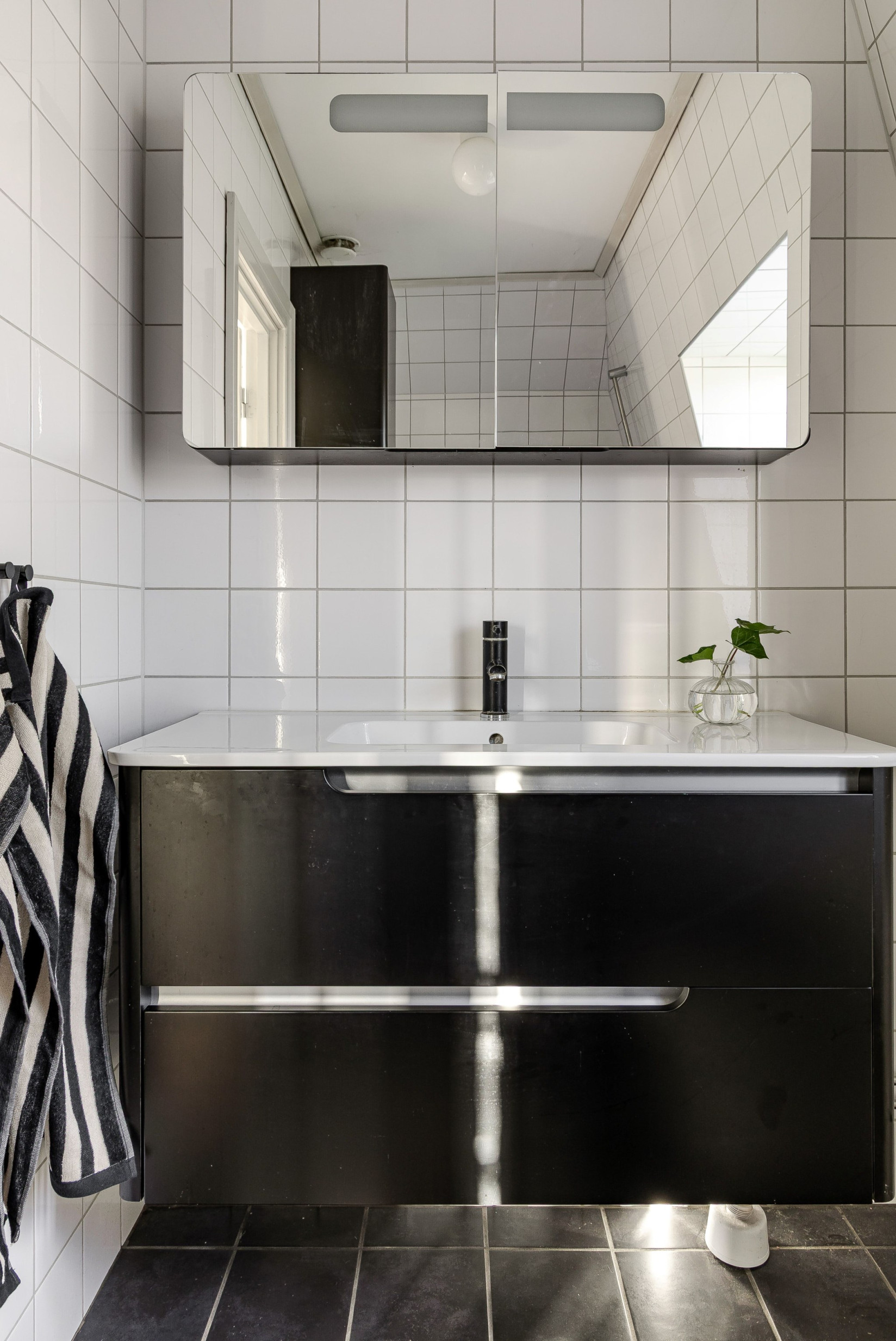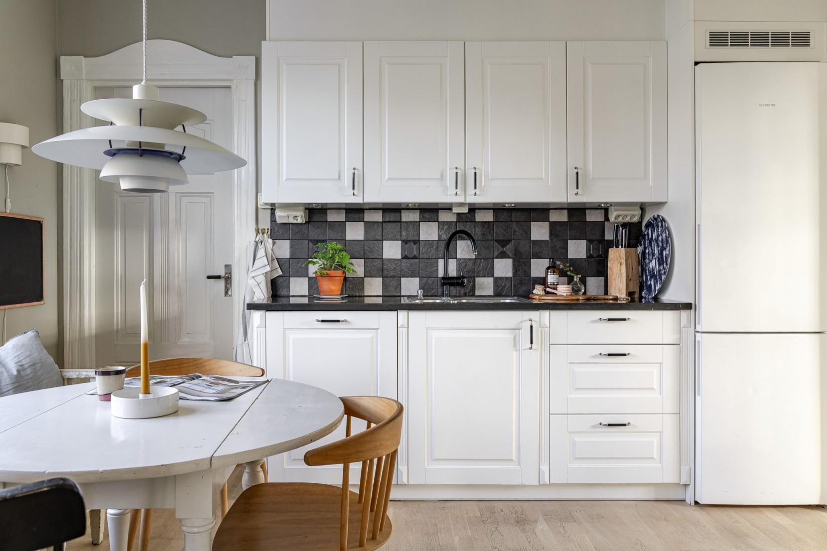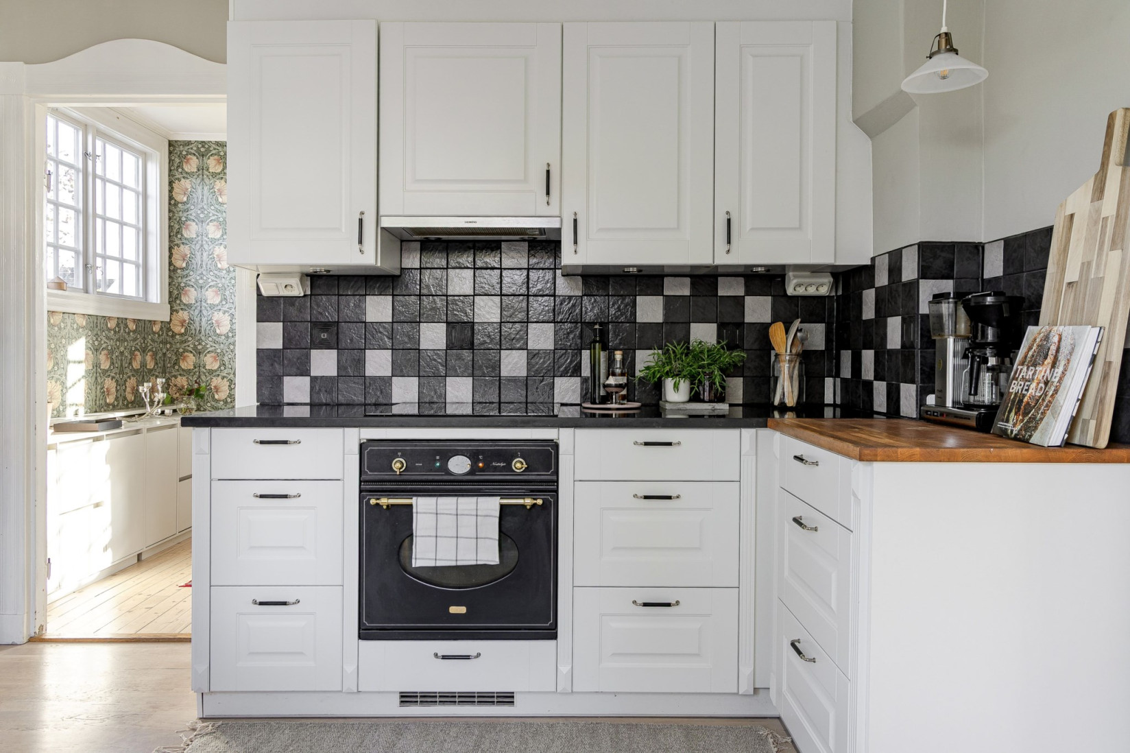 Hallen leder dig vidare till köket, där stilrena materialval och moderna funktioner möter äldre tiders charm på ett harmoniskt sätt. Här råder en hemtrevlig och varm atmosfär, ett rum att trivas i till vardags såväl som vid långdragna middagar. Ett större matbord ryms utan problem framför fönstret som vetter ut mot den lummiga baksidan. Köket är utrustat med kyl/frys, fläkt, häll, ugn och diskmaskin.