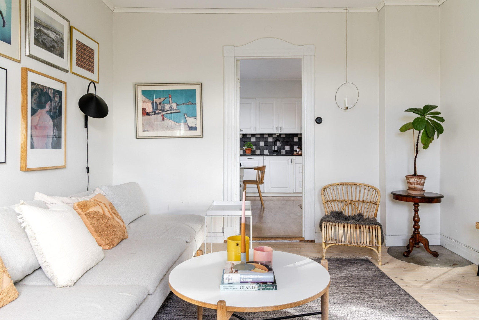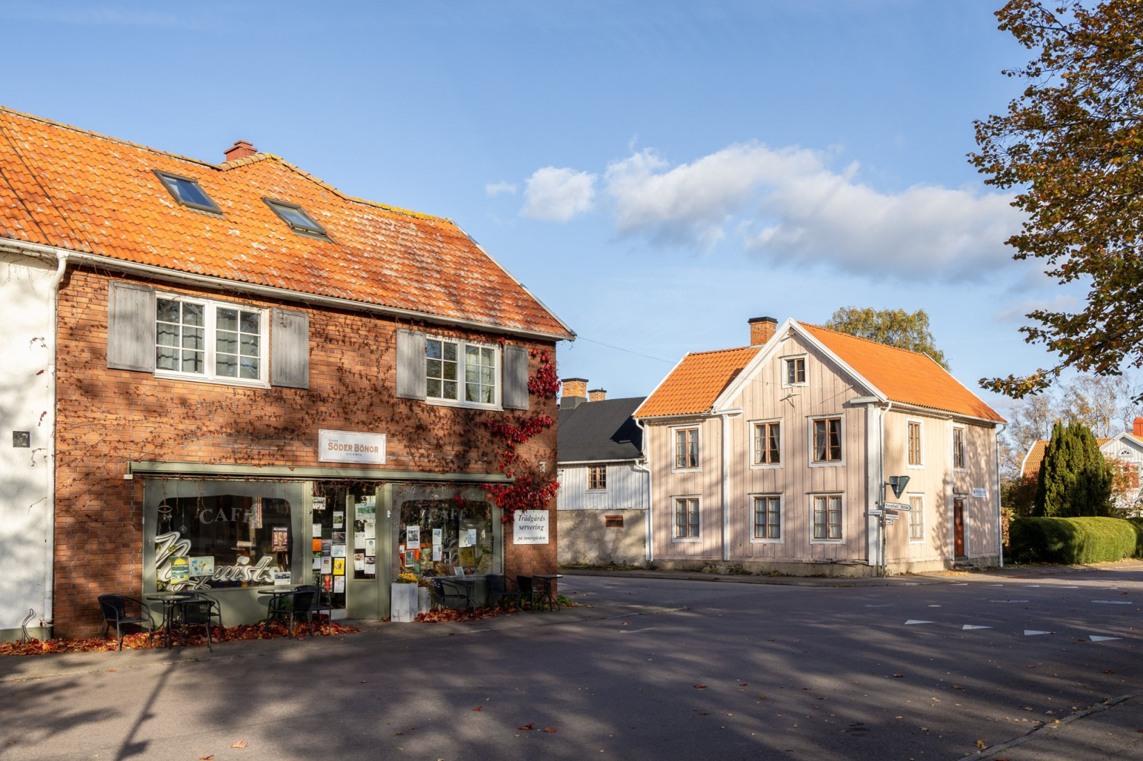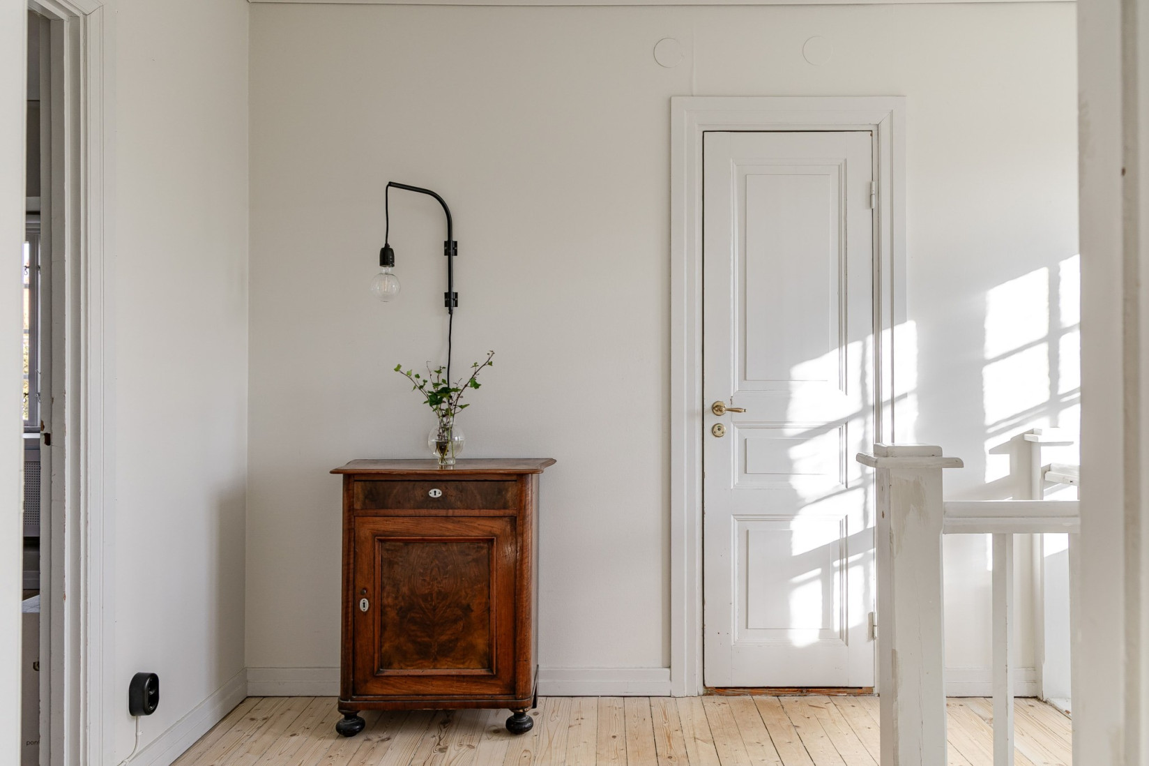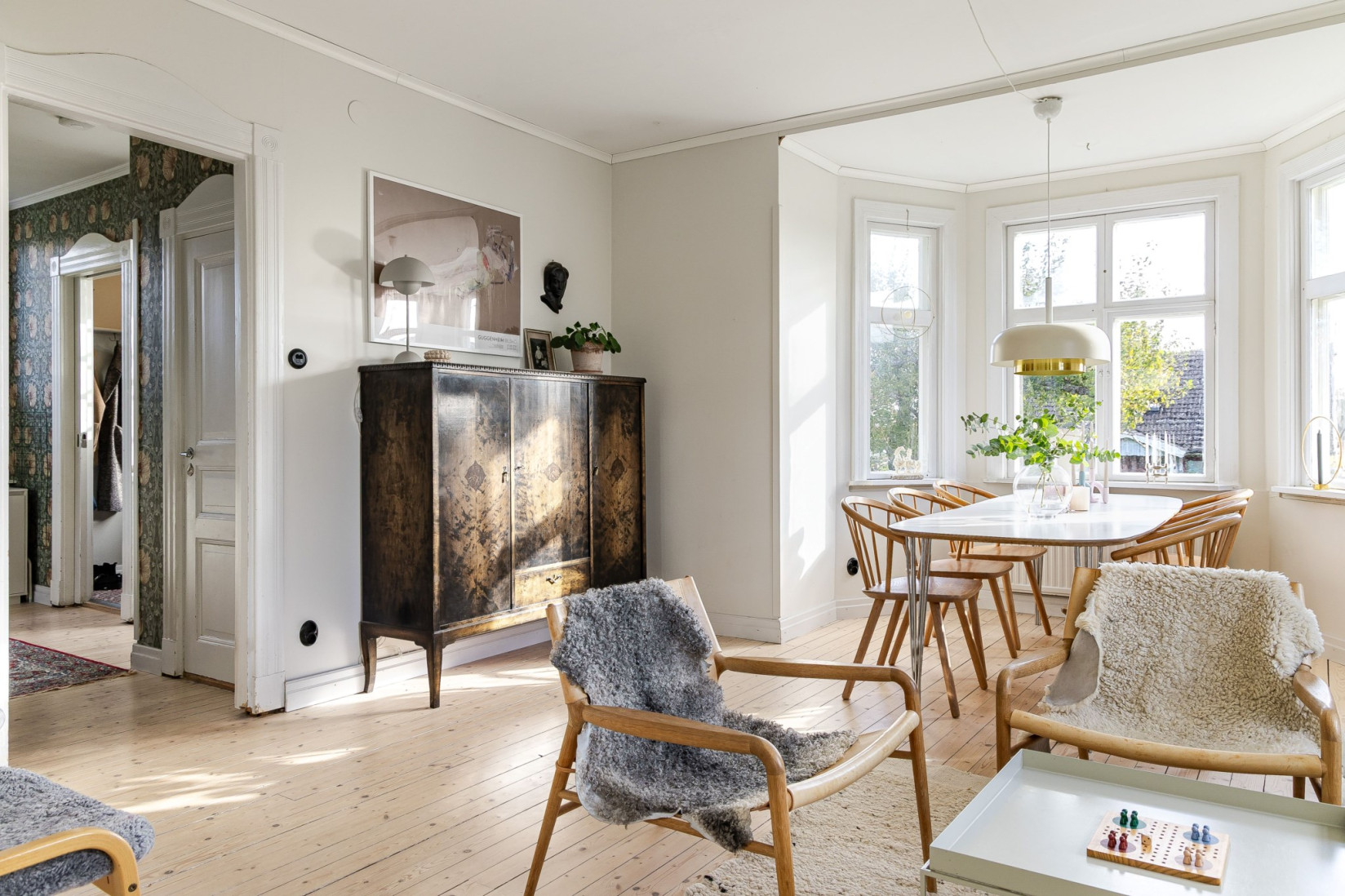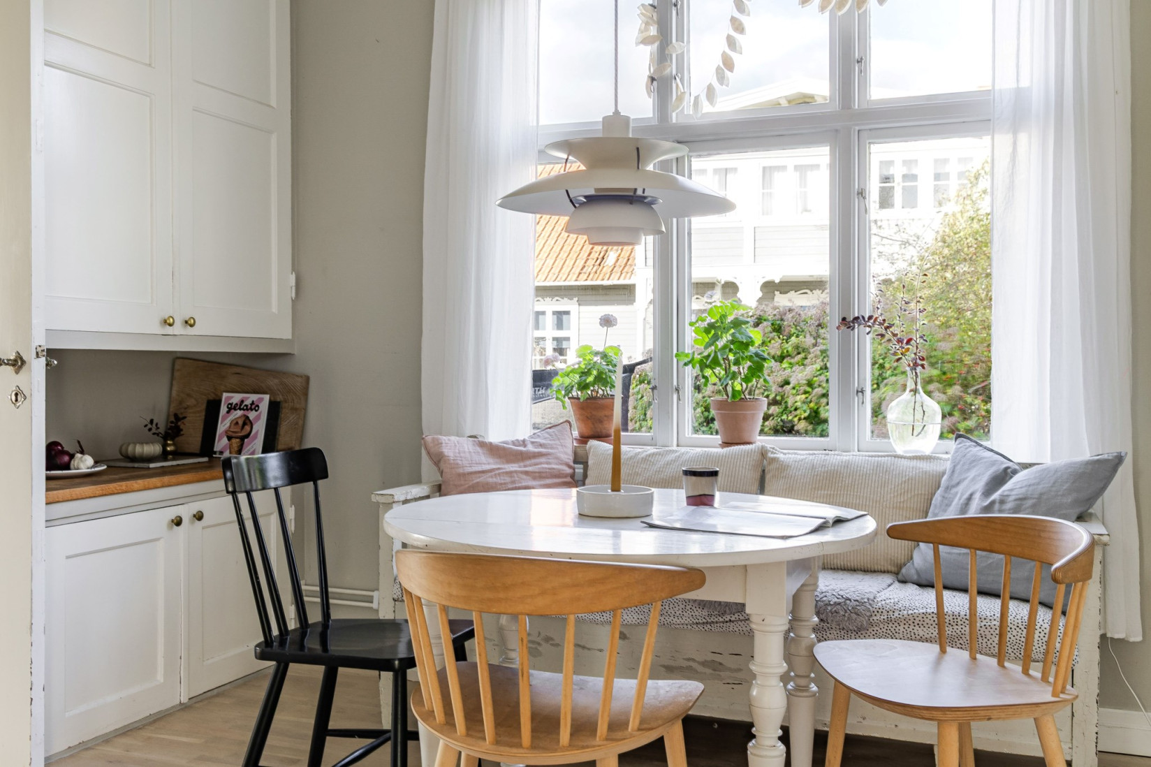 Hallen leder dig vidare till köket, där stilrena materialval och moderna funktioner möter äldre tiders charm på ett harmoniskt sätt. Här råder en hemtrevlig och varm atmosfär, ett rum att trivas i till vardags såväl som vid långdragna middagar. Ett större matbord ryms utan problem framför fönstret som vetter ut mot den lummiga baksidan. Köket är utrustat med kyl/frys, fläkt, häll, ugn och diskmaskin.
