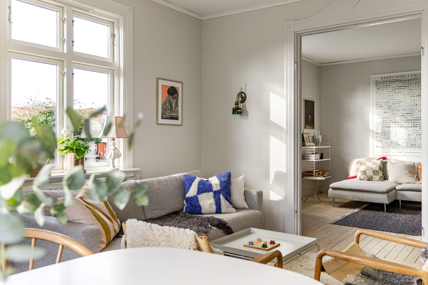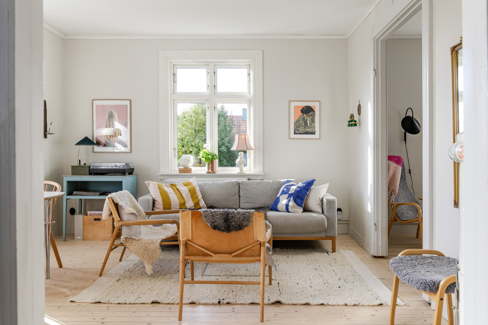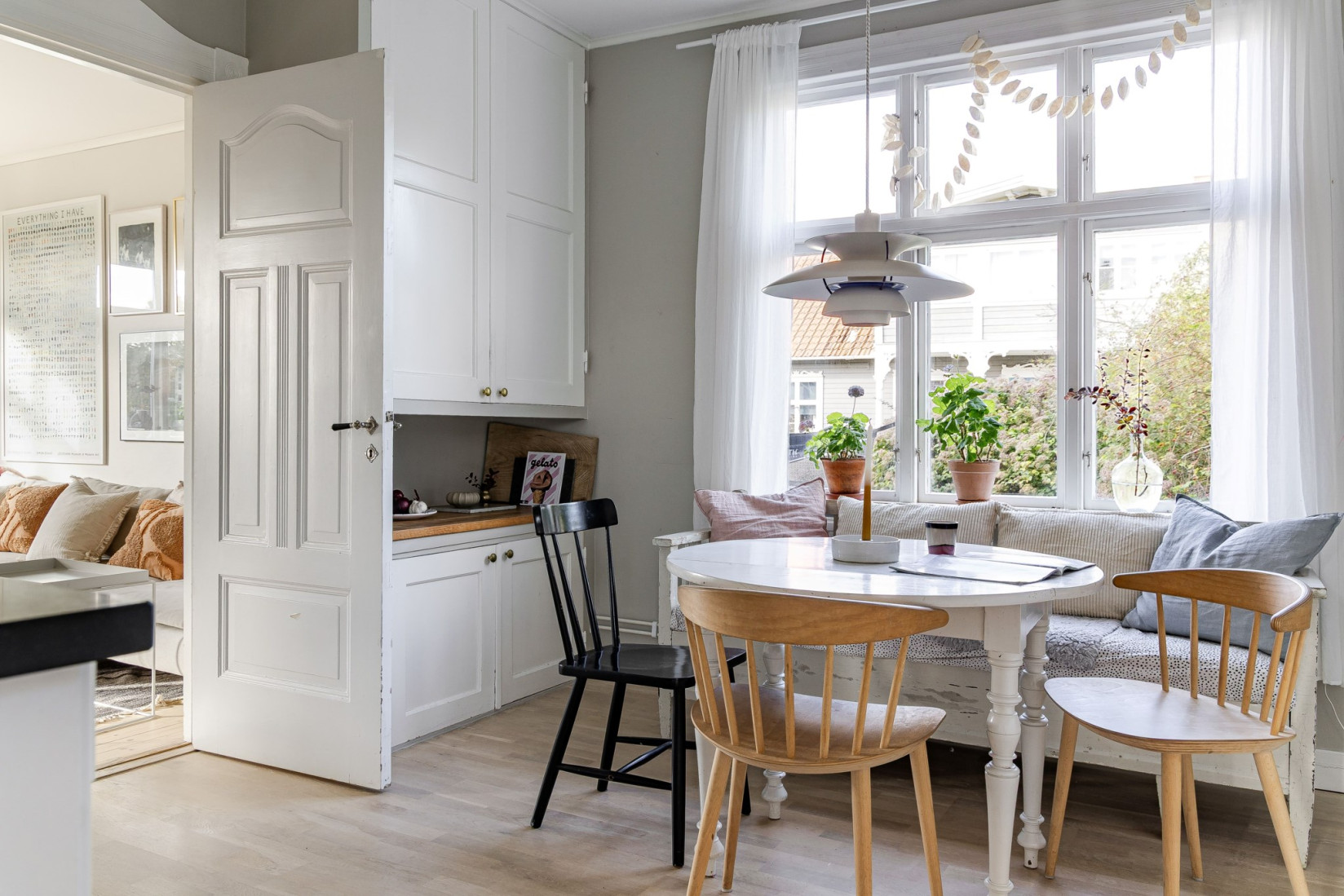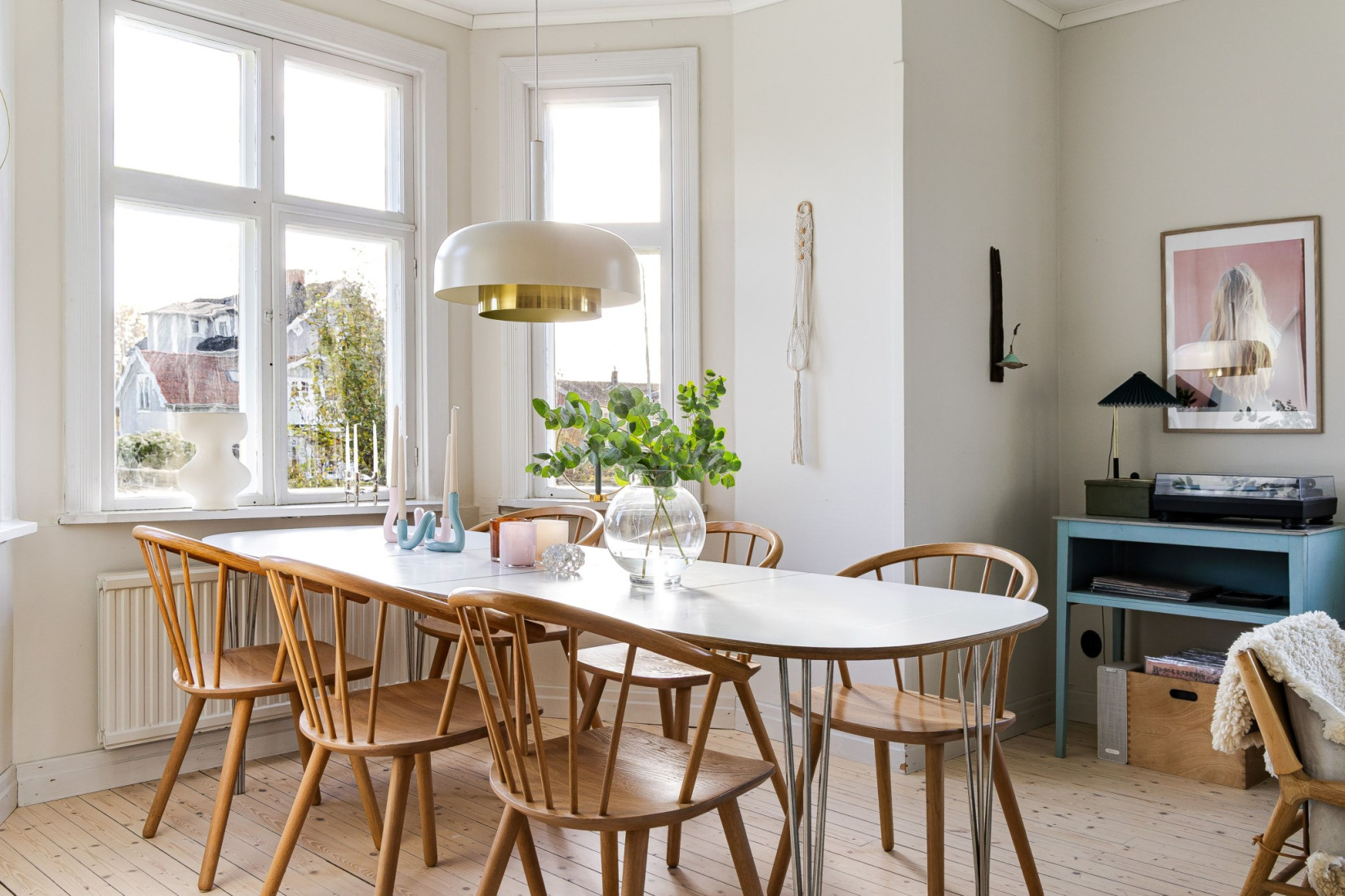 Hallen leder dig vidare till köket, där stilrena materialval och moderna funktioner möter äldre tiders charm på ett harmoniskt sätt. Här råder en hemtrevlig och varm atmosfär, ett rum att trivas i till vardags såväl som vid långdragna middagar. Ett större matbord ryms utan problem framför fönstret som vetter ut mot den lummiga baksidan. Köket är utrustat med kyl/frys, fläkt, häll, ugn och diskmaskin.