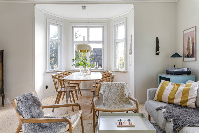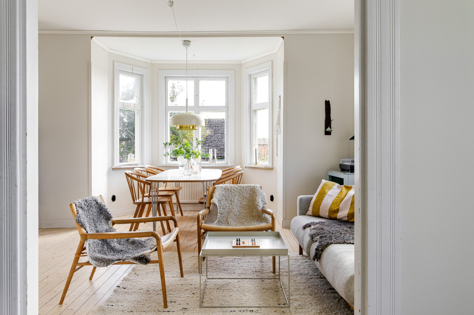 Från köket tar du dig vidare till familjens mysiga tv-rum, ett trivsamt utrymme där den stora soffan, tv och ytterligare möblemang får gott om plats. I anslutning ligger ett sagolikt rum med ljusinsläpp från två håll. Burspråket bjuder in till en självklar plats för matbord, men rummet fungerar lika fint som sällskapsrum med soffa och fåtöljer, eller efter de behov som passar just dig. I ena hörnan står en vacker kakelugn som skänker karaktär. I båda rummen pryds golven av det charmiga plankgolvet.