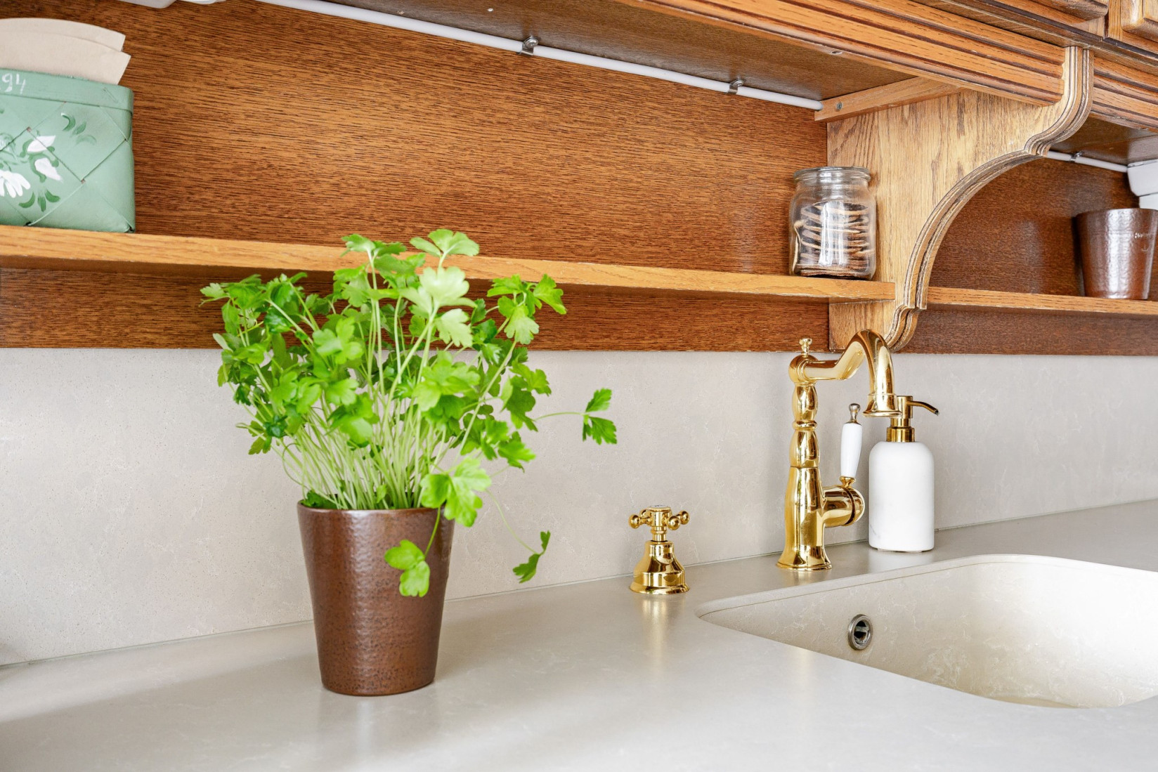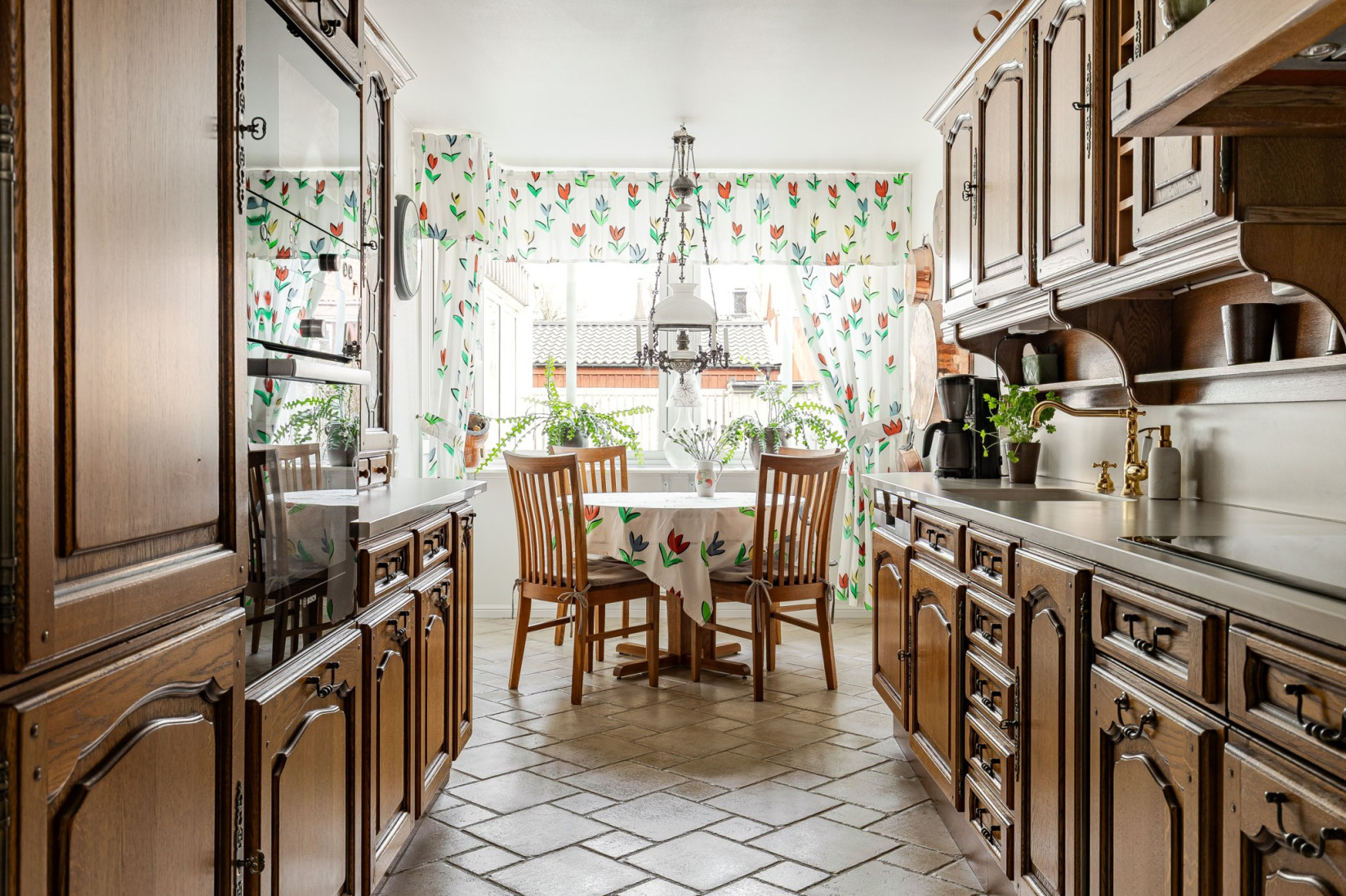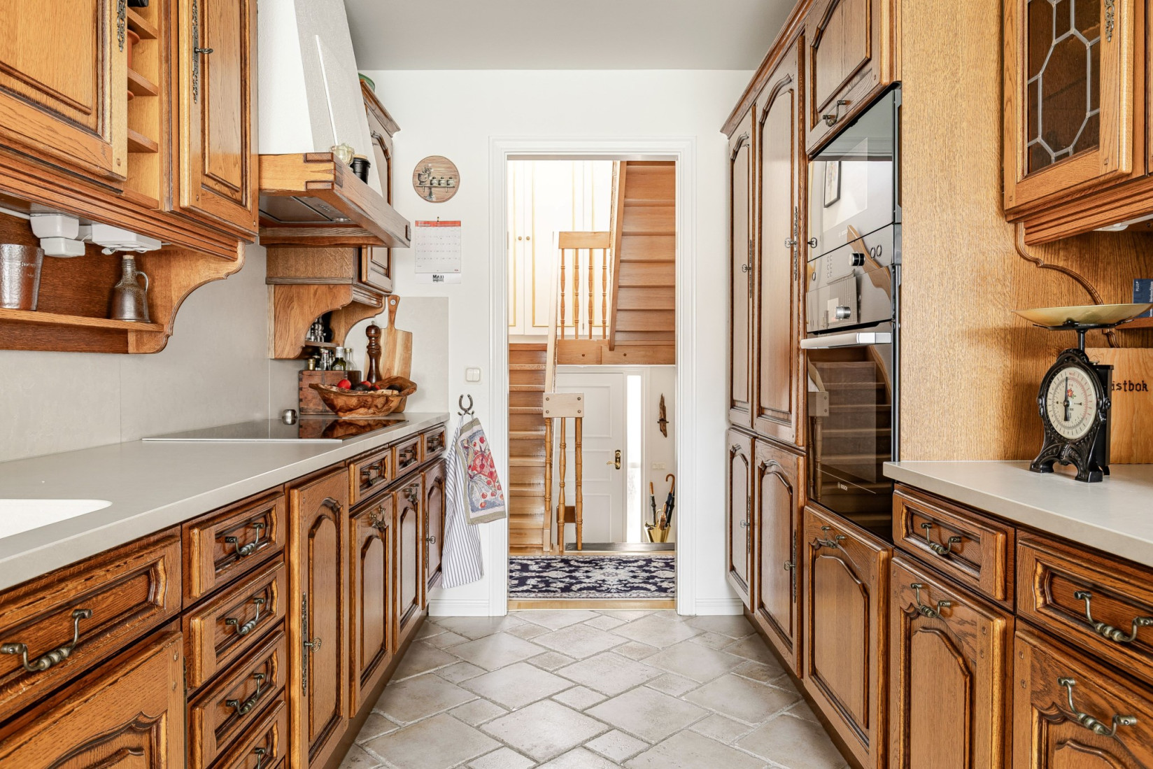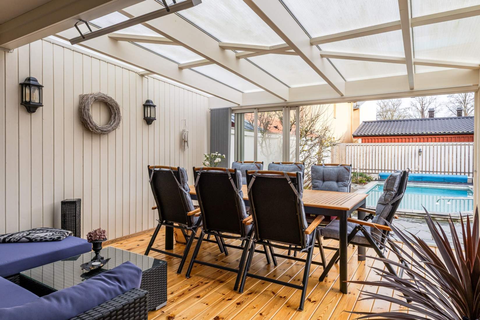 Vardagsrummet ligger i direkt anslutning till det välplanerade köket i massiv ek, ett kök som gör sig förtjänt av men också hålls väldigt fint i många år framåt av en modernisering istället för total renovering. Köket har gott om förvaring och bänkyta för att kunna nyttjas till vardag som till fest. I köket finns plats för matbord och det är också här, precis som från vardagsrummet som vi har utgången till den inglasade altanen och den fantastiska stenlagda baksidan med stor pool.