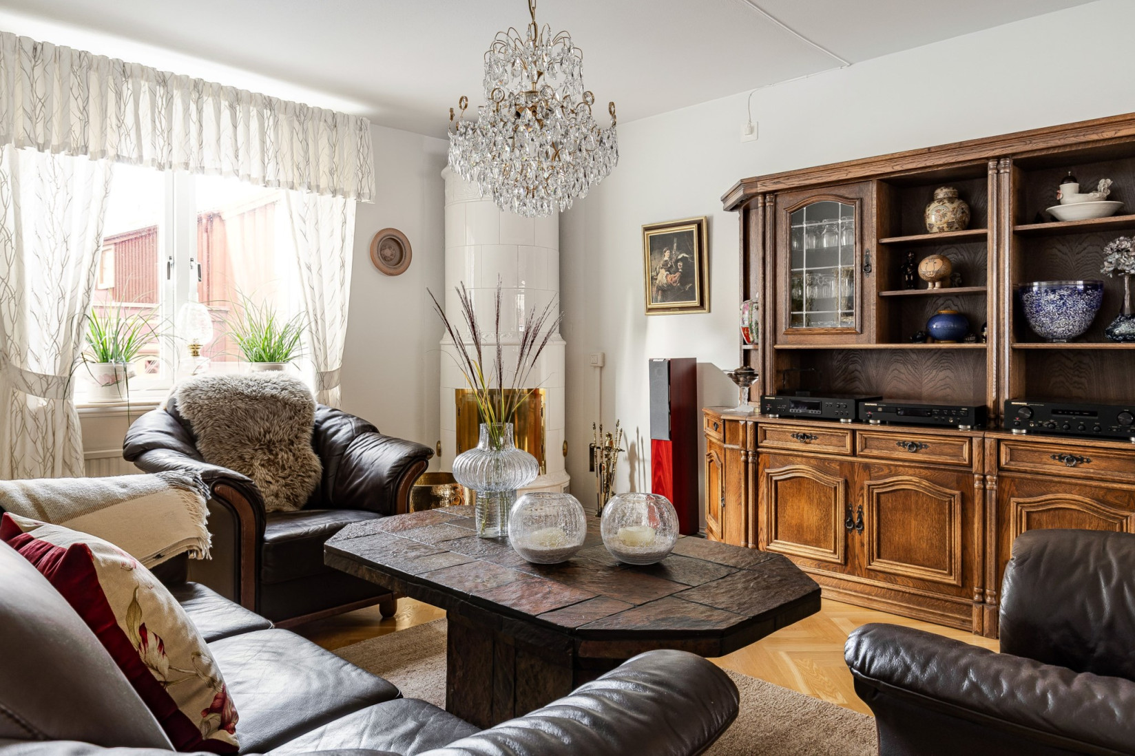 När vi kommer innanför dörren möts vi av den ljusa och fräscha hallen där det finns gott om plats att hänga av oss kläderna. Vi går några steg upp och kan direkt kliva in i det stora och väl tilltagna vardagsrummet med värmande kakelugn.