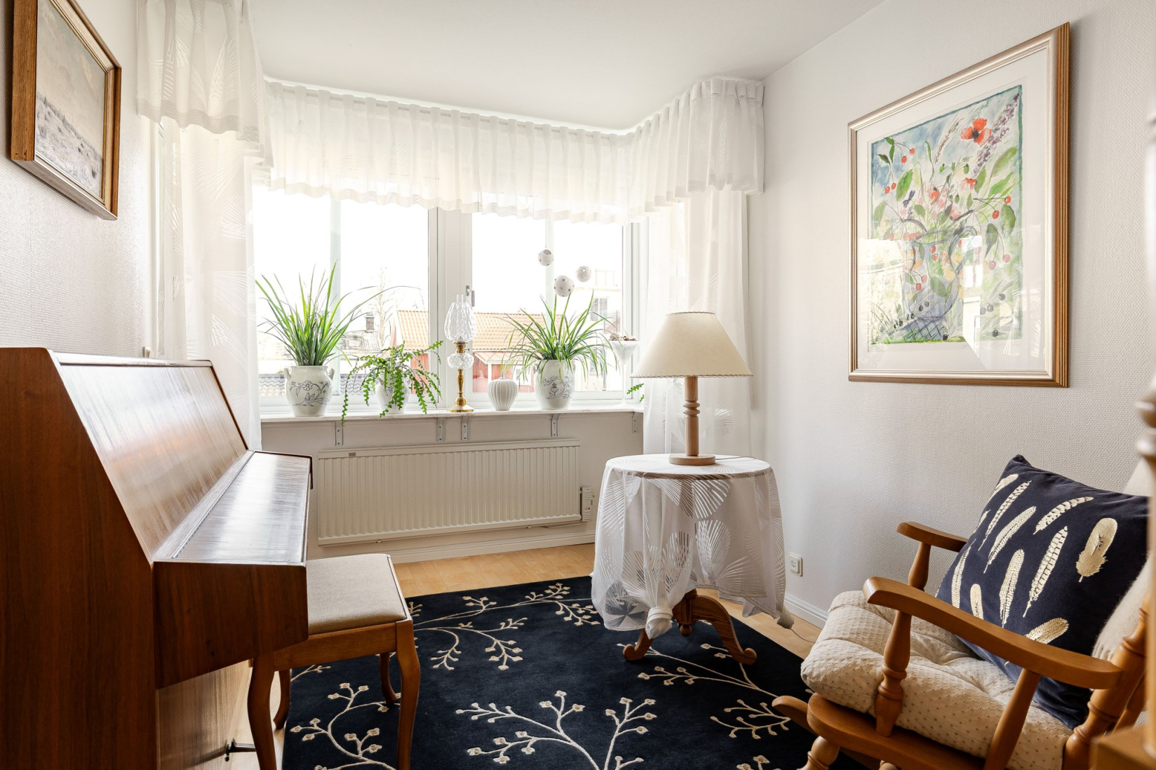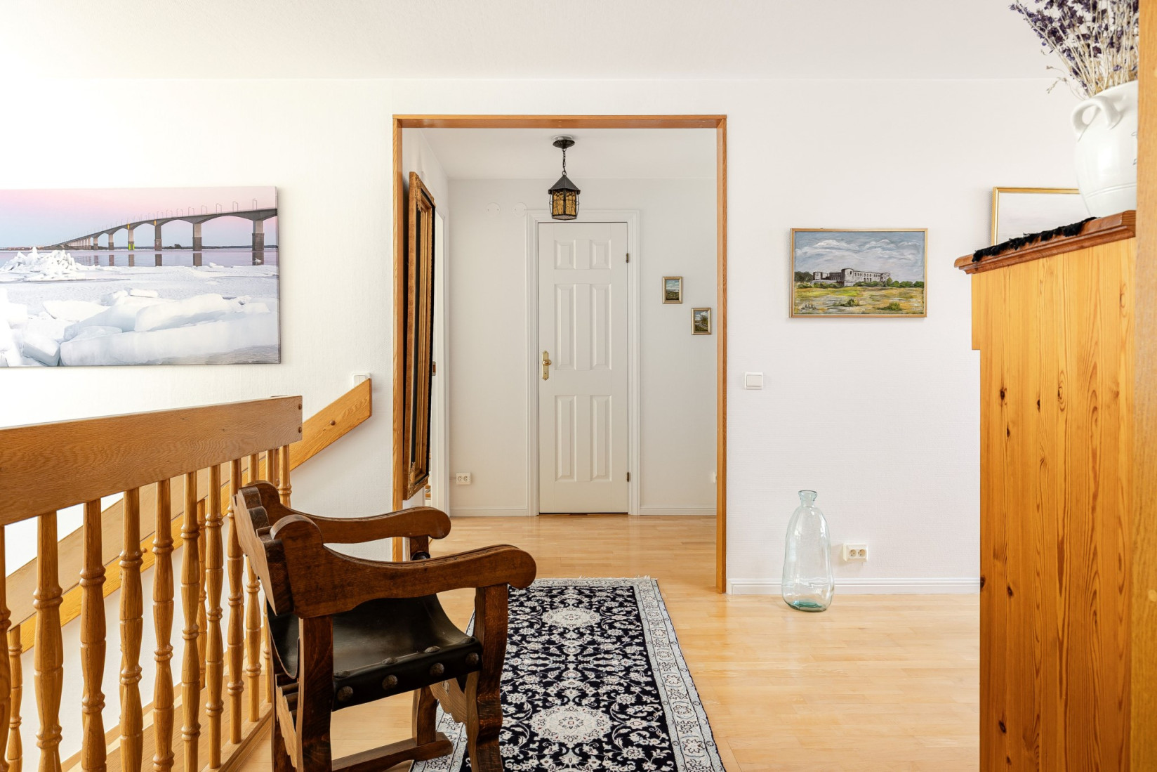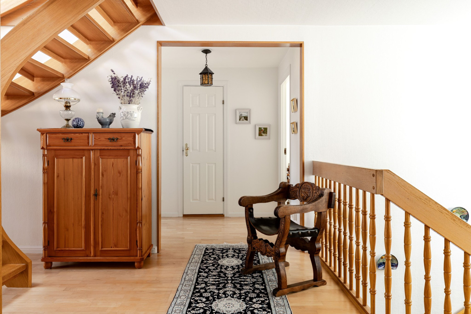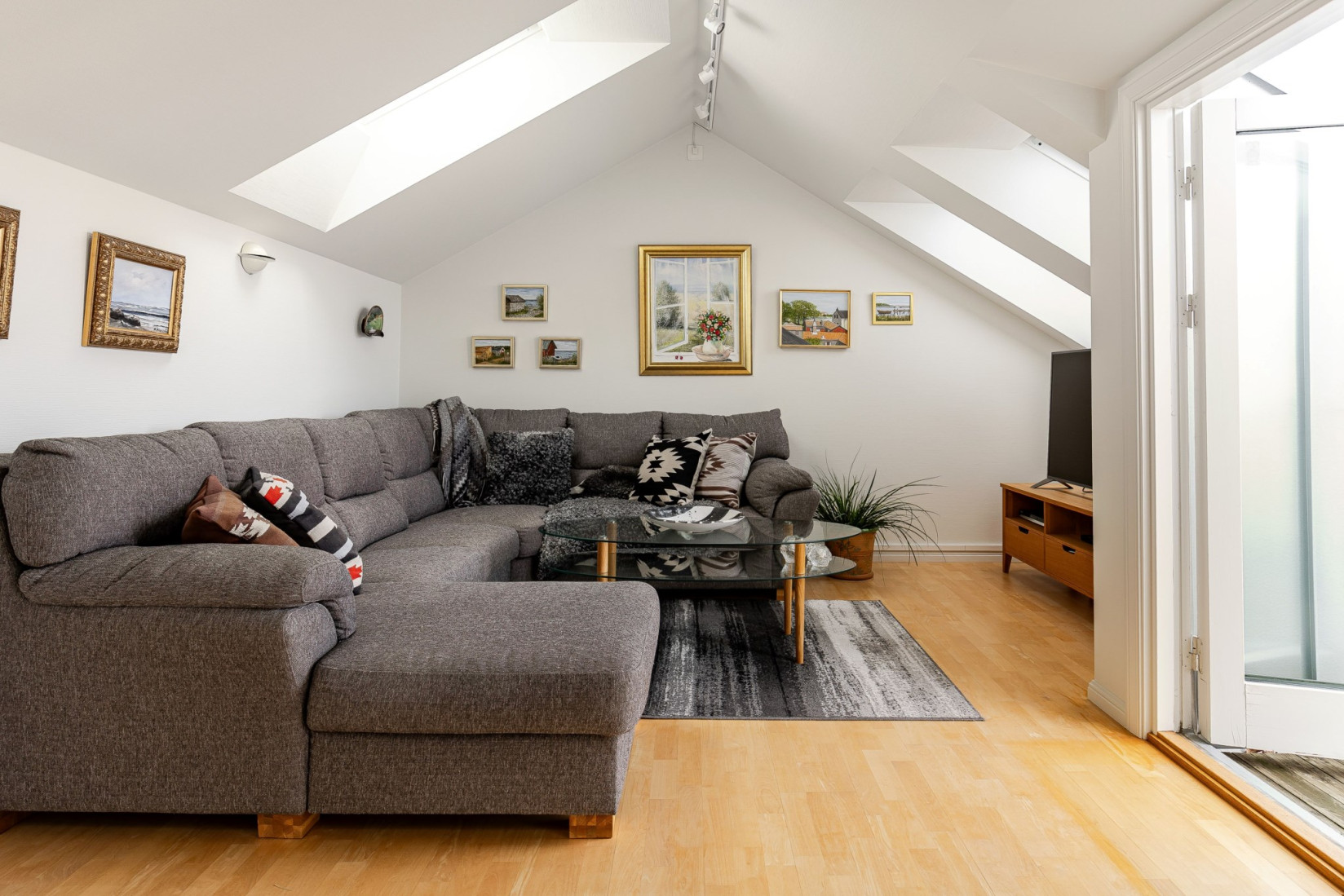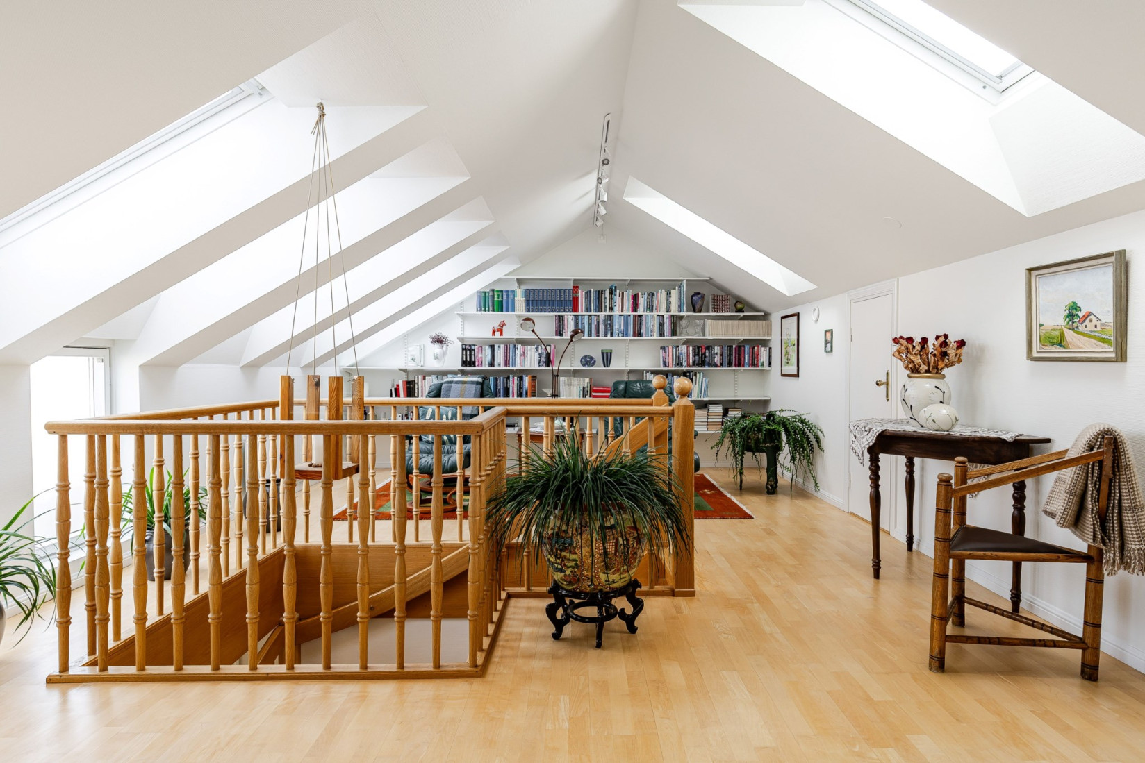Följer vi trappan upp till högsta våningen slås vi av det härliga ljusinsläppet tack vare flertalet takfönster.