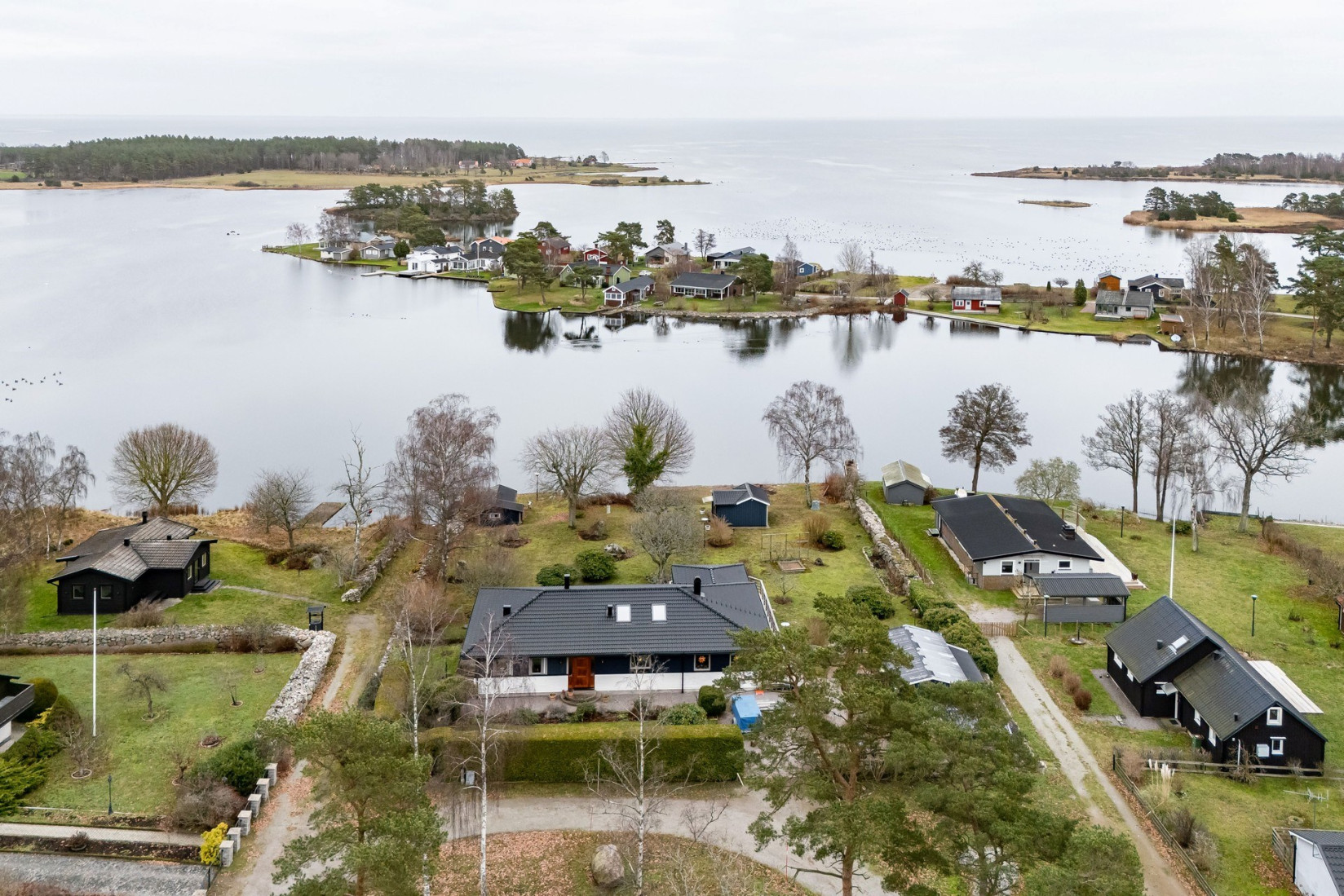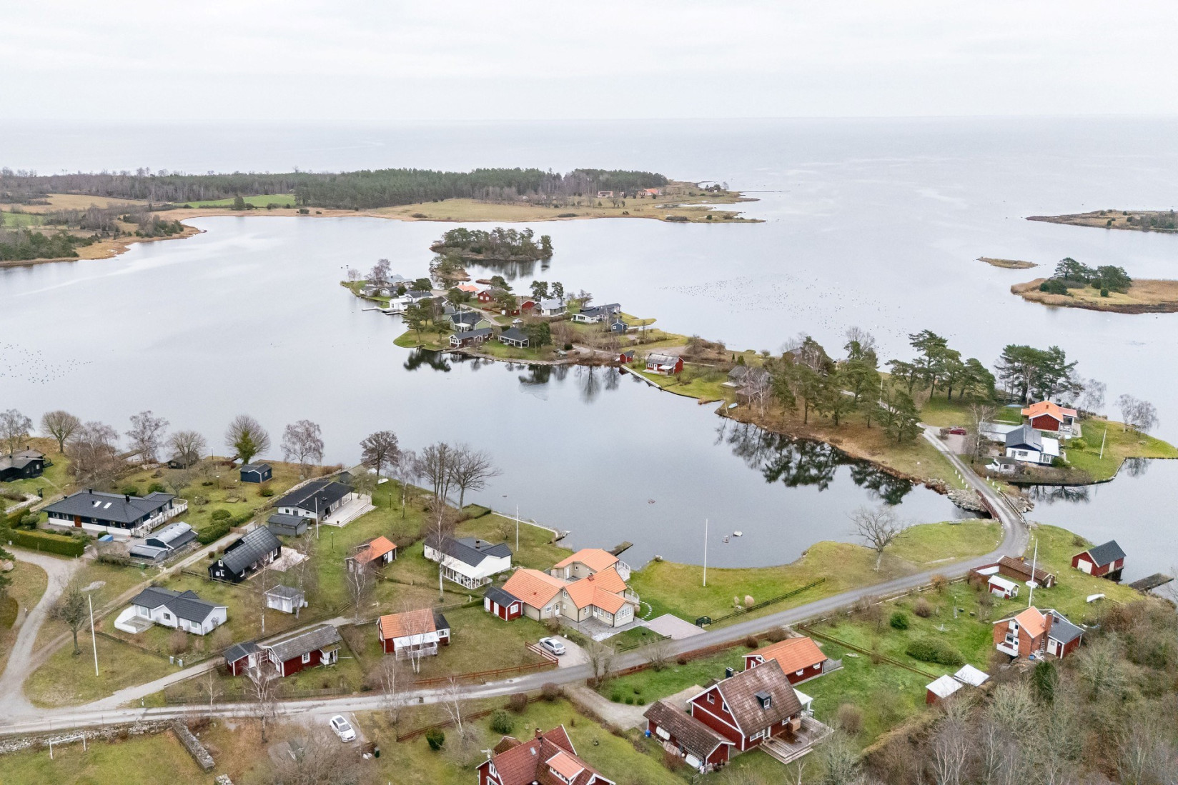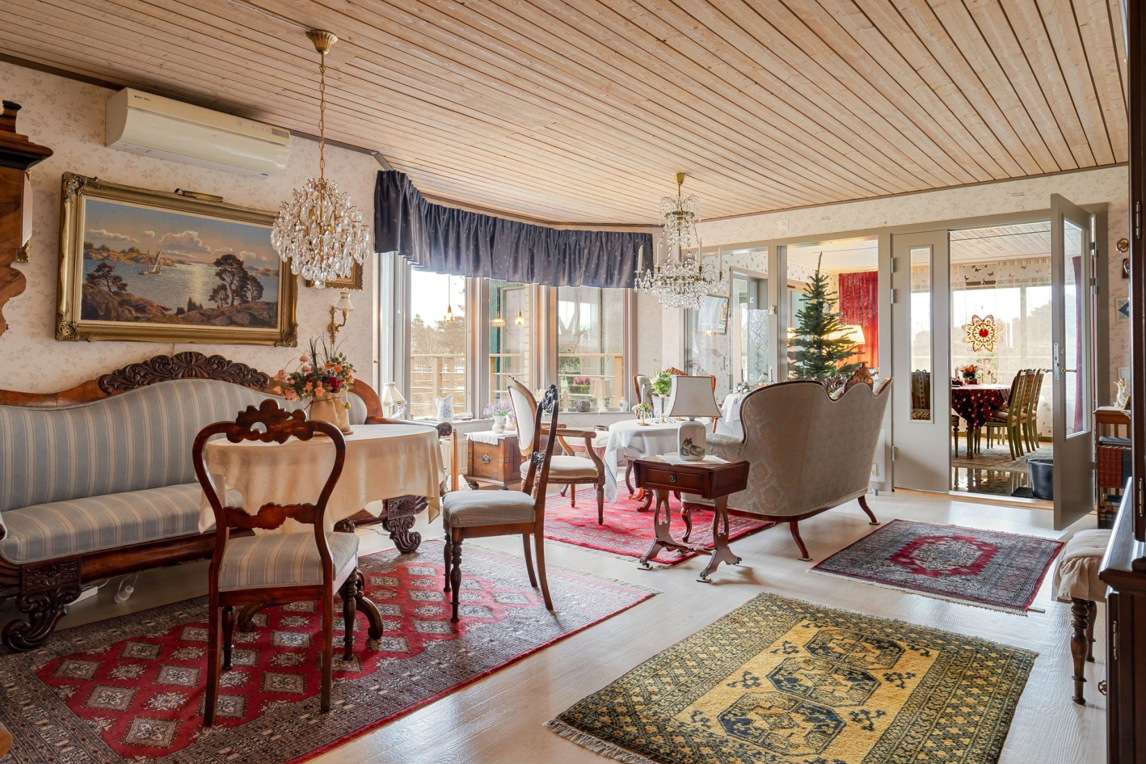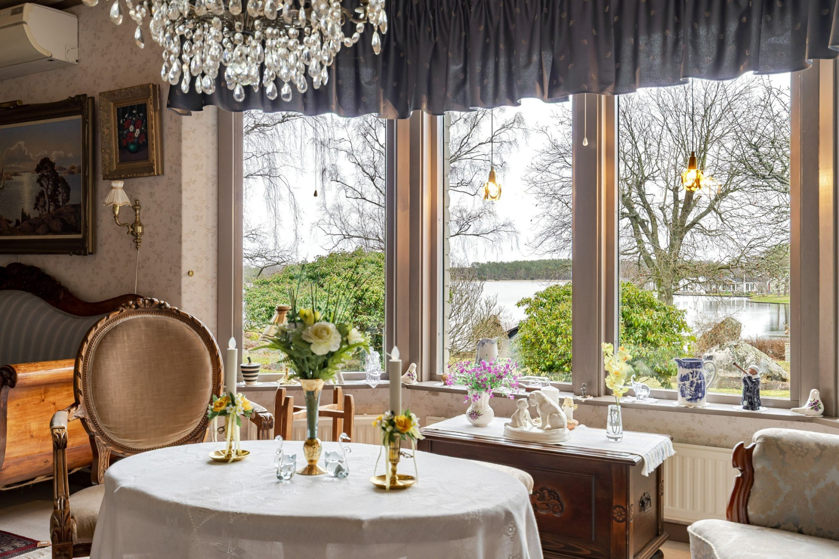 Intill köket finner vi en större sällskapsyta där såväl matplats som en soffgrupp inryms. Centralt placerad i rummet, en värmande kamin som ingjuter såväl en härlig känsla som komfort. Det stora sällskapsrummet förlängs med en tillbyggd och inglasad del. Förmodligen är det här ni kommer att avnjuta era frukostar i takt med att solen går upp över ett glittrande Kalmarsund.