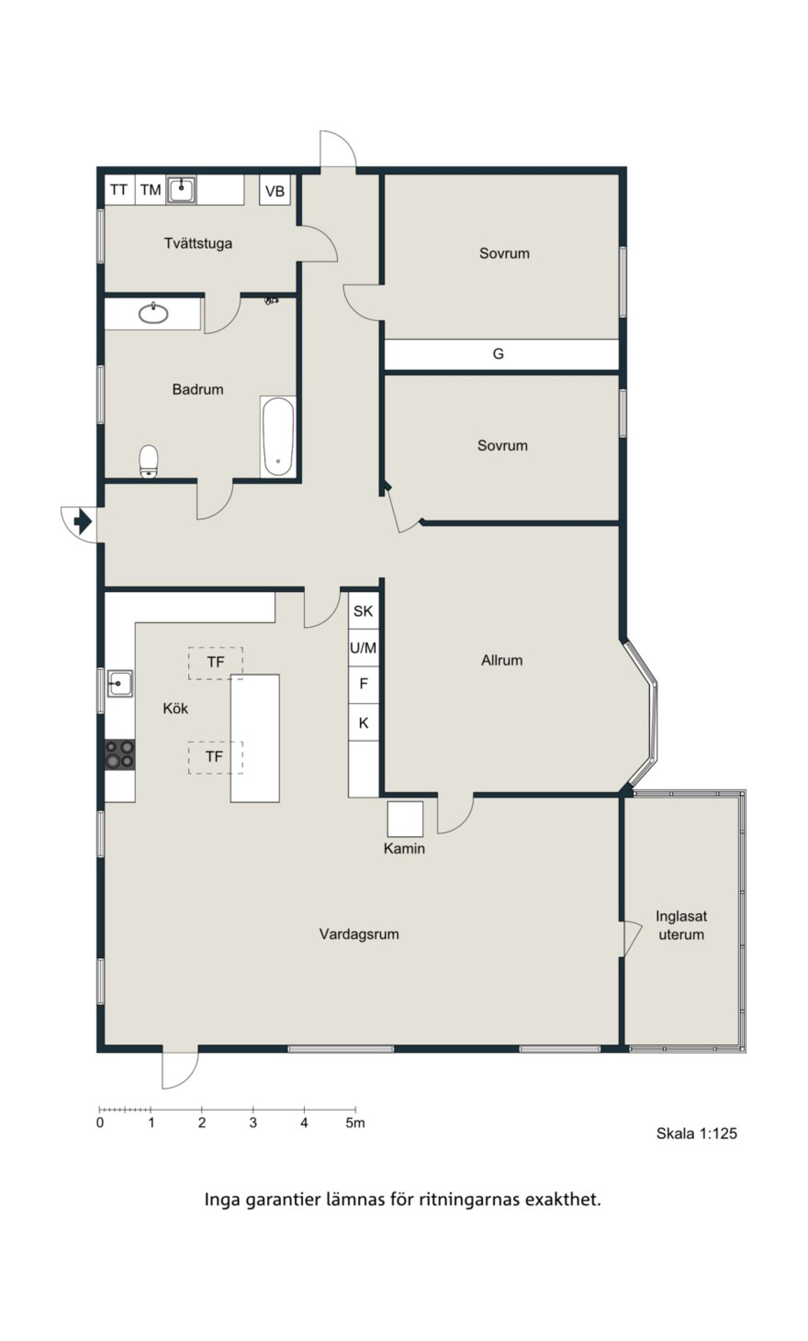 Från de sociala ytorna rör vi oss vidare mot andra delen av huset. Den mer privata. Här väntar två sovrum, ett trevligt allrum/finrum för härligt samkväm, samt badrum med såväl dusch som badkar och en rymlig och praktisk tvättstuga med tvätt och tork samt plats för såväl förvaring som strykbräda.